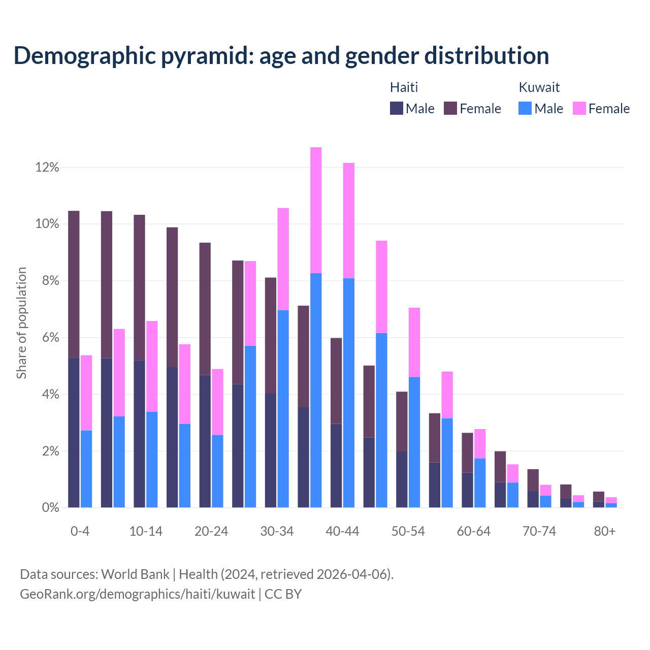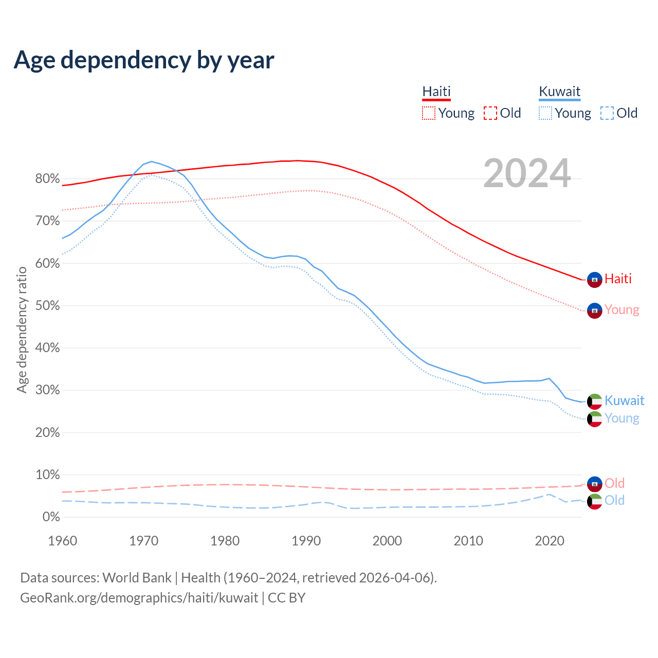 - The share of old-age demographic (65+) in Haiti is 4.71% vs 3.1% in Kuwait.
