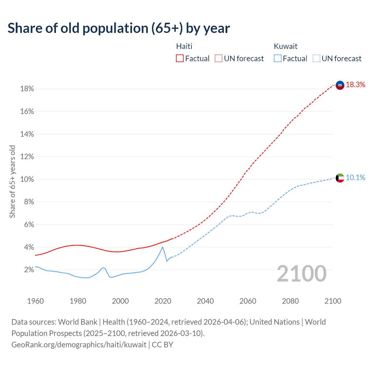 The share of older people aged 65 and over is 4.71% in Haiti and 3.1% in Kuwait. Life expectancy in Haiti compared to Kuwait .