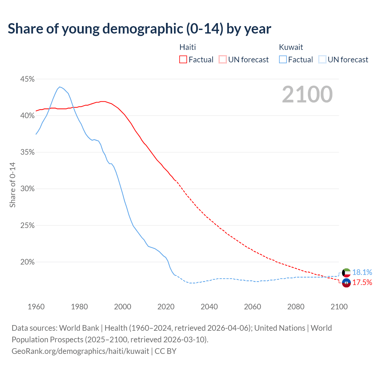 - The share of young demographic (0-15 years old) in Haiti is 31.2% vs 18.2% in Kuwait.