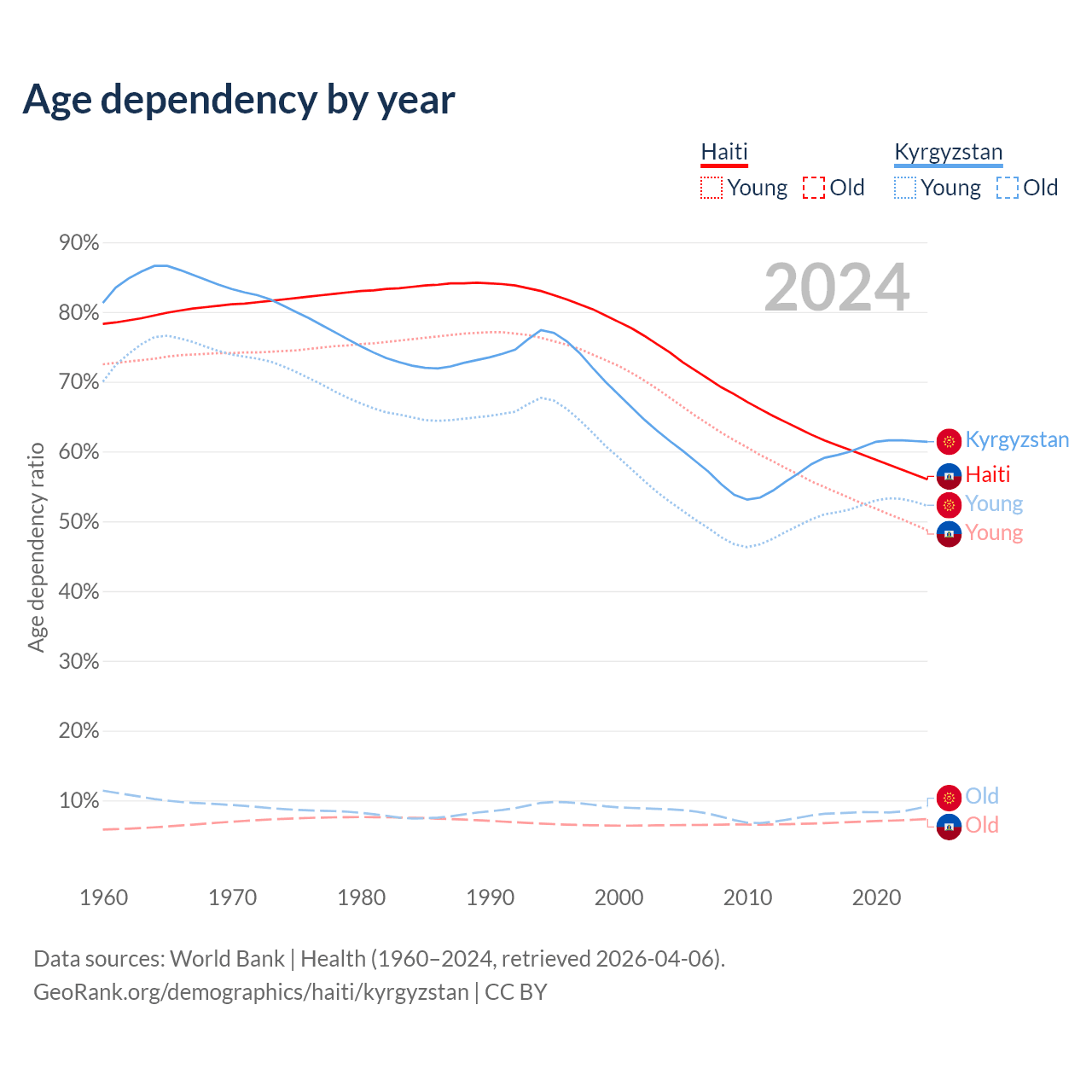 - The share of old-age demographic (65+) in Haiti is 4.71% vs 5.68% in Kyrgyzstan.