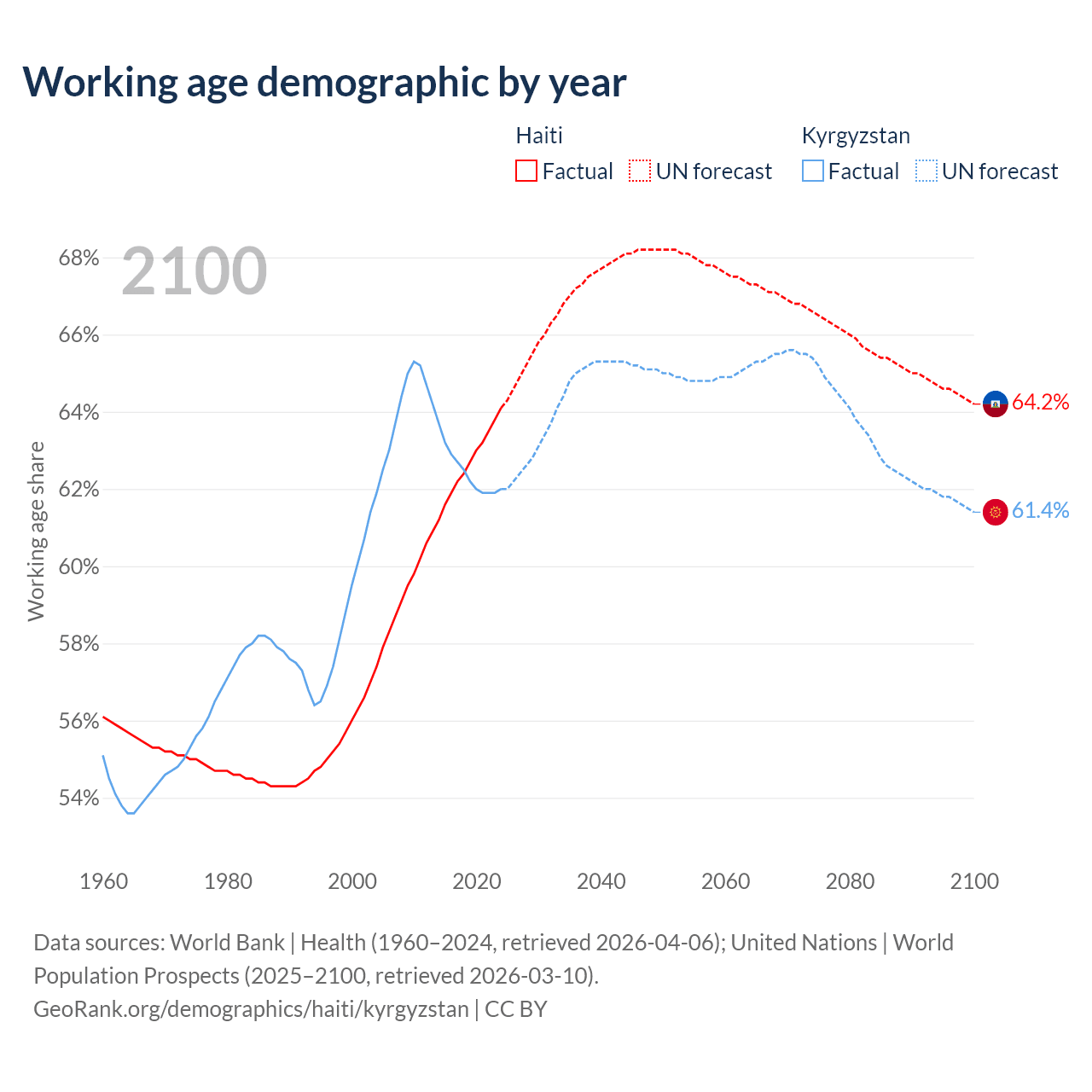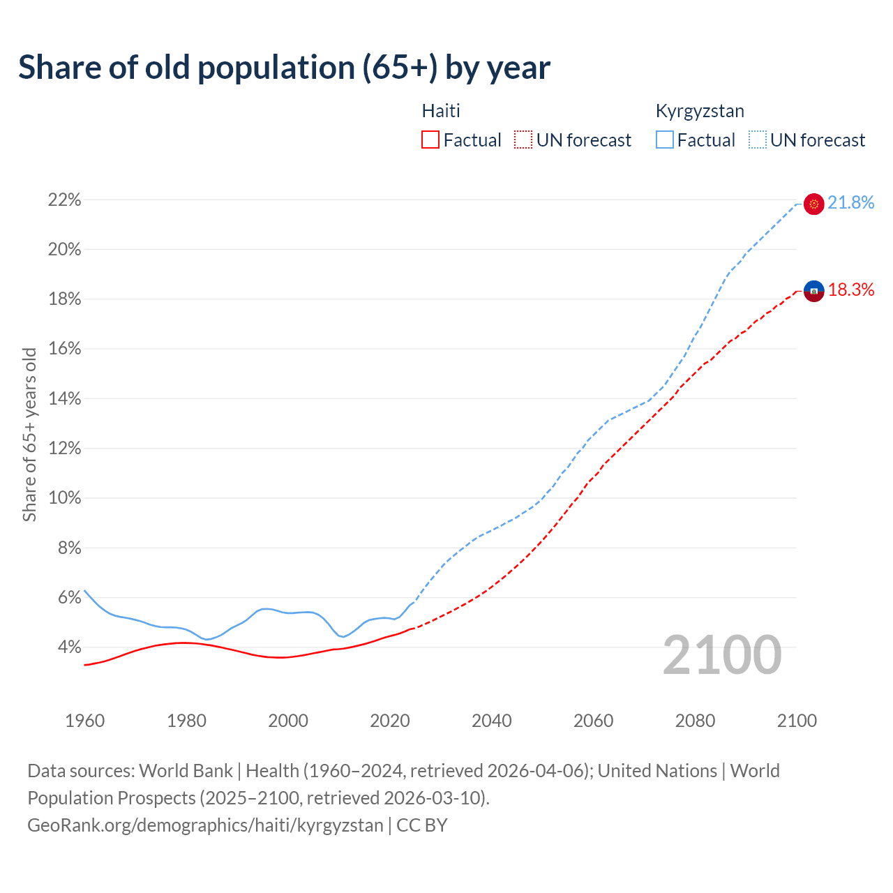 The share of older people aged 65 and over is 4.71% in Haiti and 5.68% in Kyrgyzstan. Life expectancy in Haiti compared to Kyrgyzstan .