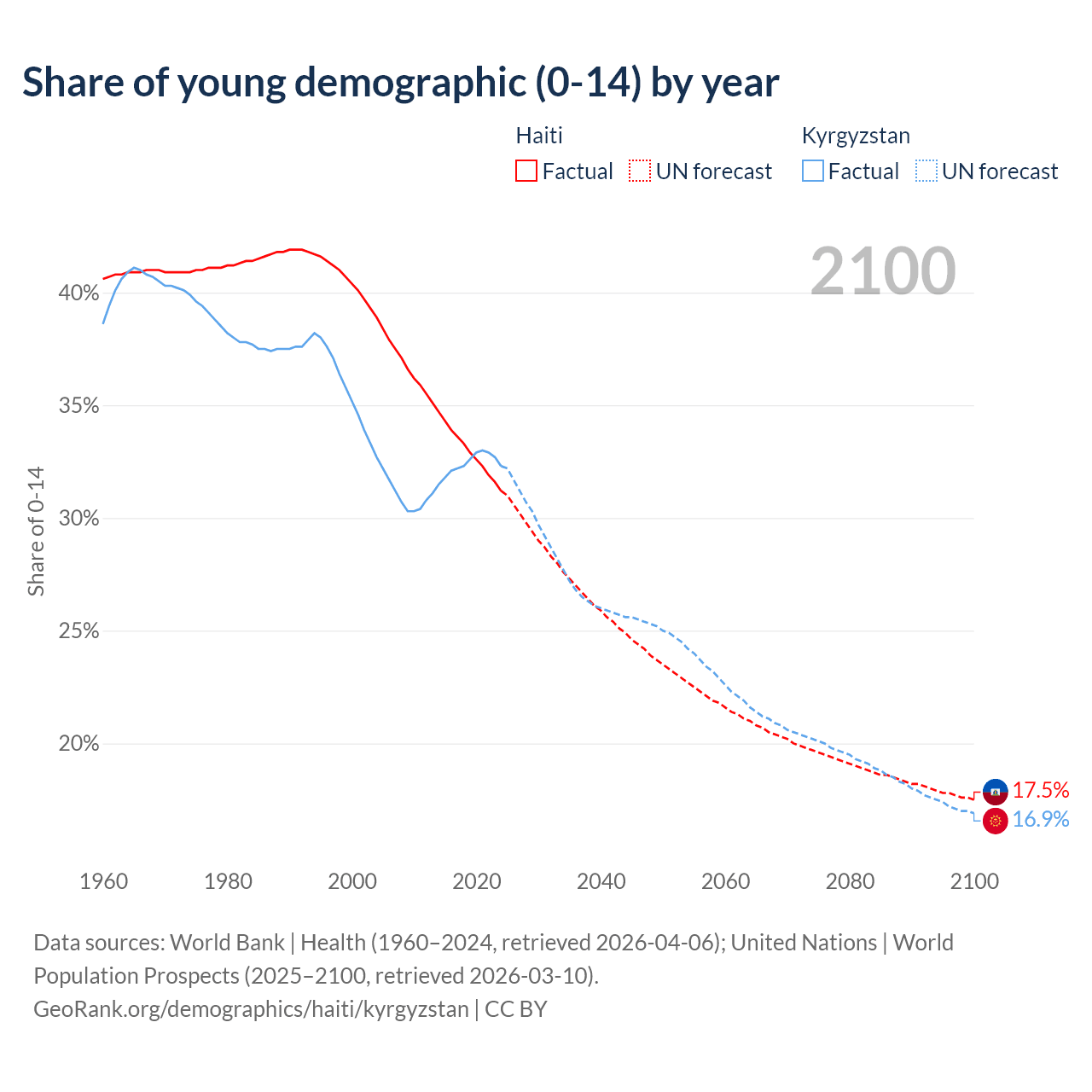 - The share of young demographic (0-15 years old) in Haiti is 31.2% vs 32.3% in Kyrgyzstan.