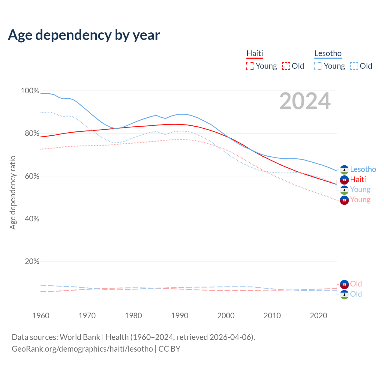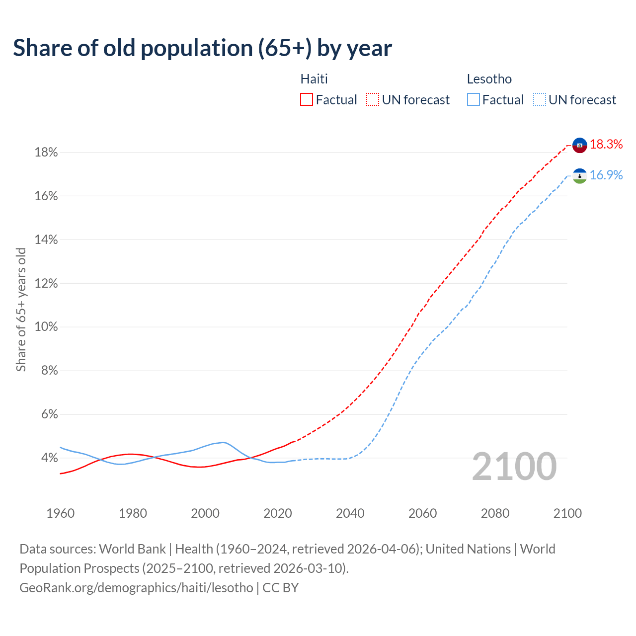 - The share of old-age demographic (65+) in Haiti is 4.71% vs 3.86% in Lesotho.