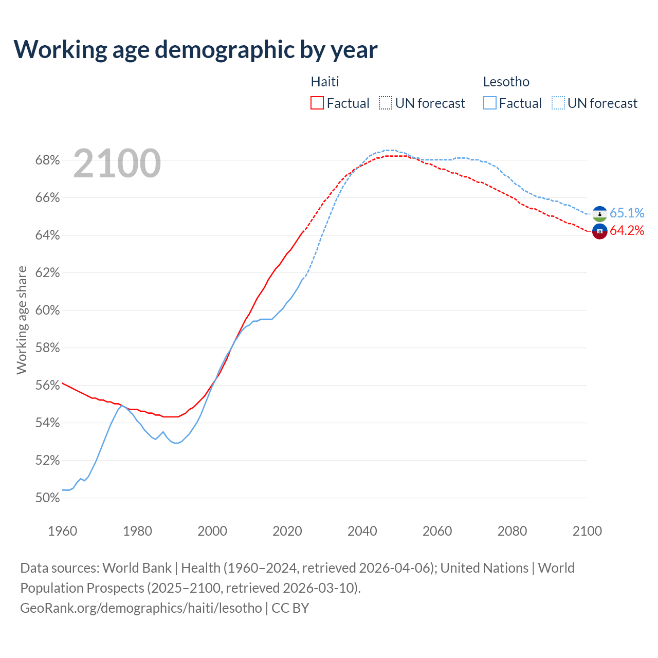 Median age Haiti vs Lesotho, 1960-2100