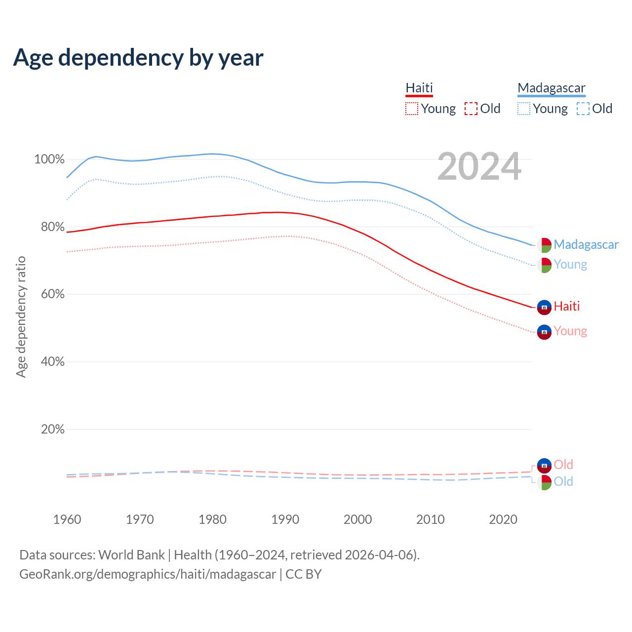 - The share of old-age demographic (65+) in Haiti is 4.71% vs 3.41% in Madagascar.