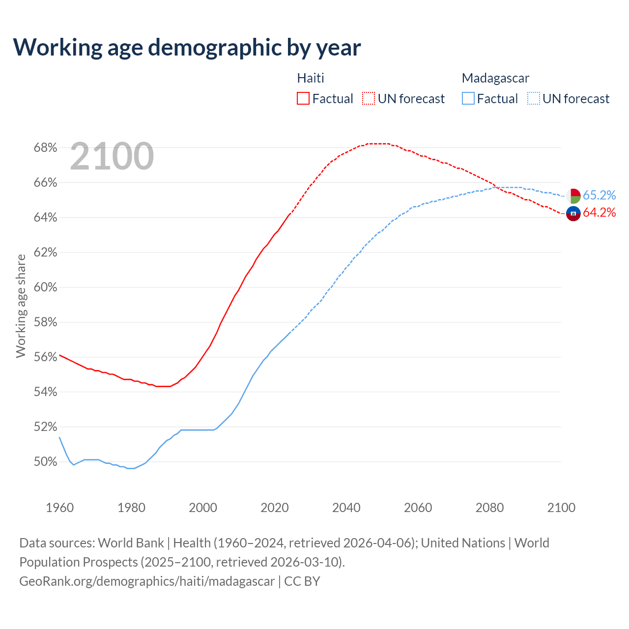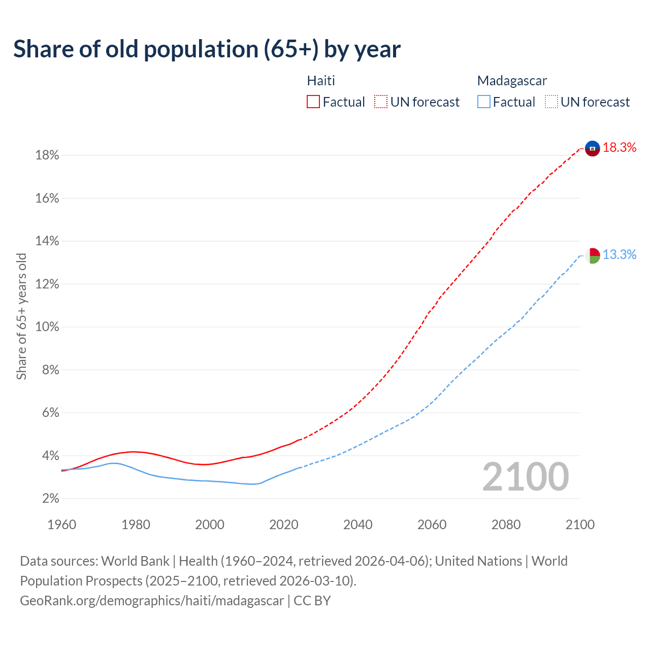 The share of older people aged 65 and over is 4.71% in Haiti and 3.41% in Madagascar. Life expectancy in Haiti compared to Madagascar .