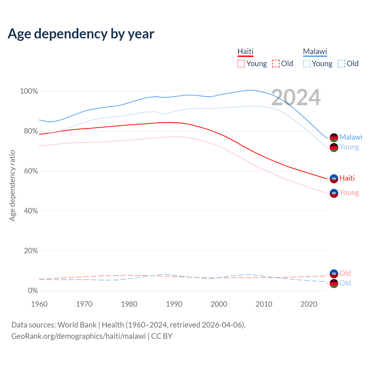 - Haiti is ranked 135/196 by median age (oldest to youngest) vs 181/196 for Malawi.