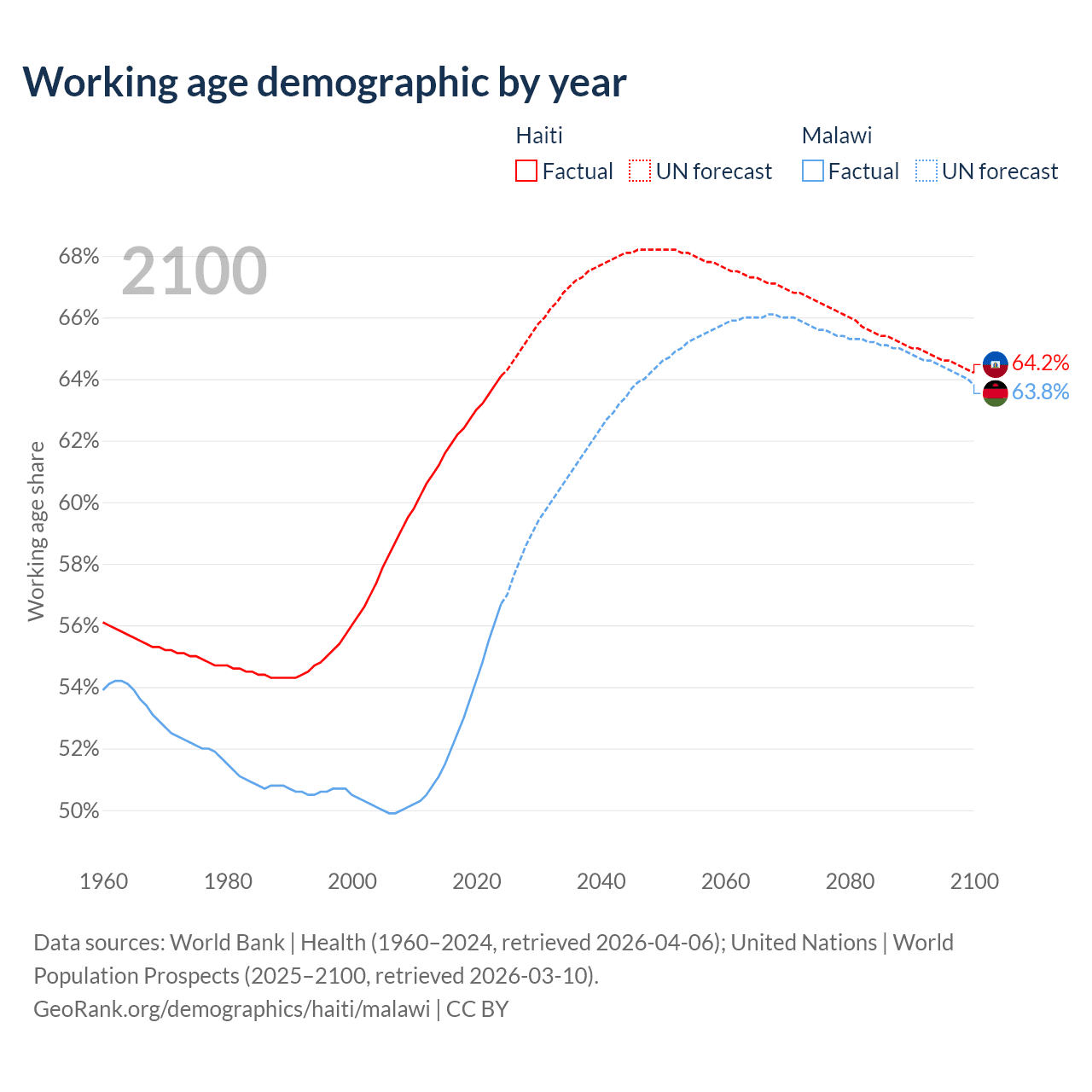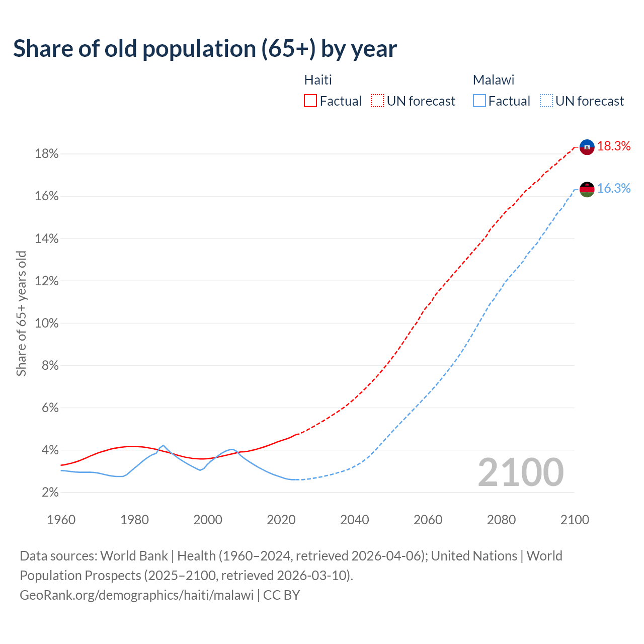 - The share of old-age demographic (65+) in Haiti is 4.71% vs 2.59% in Malawi.