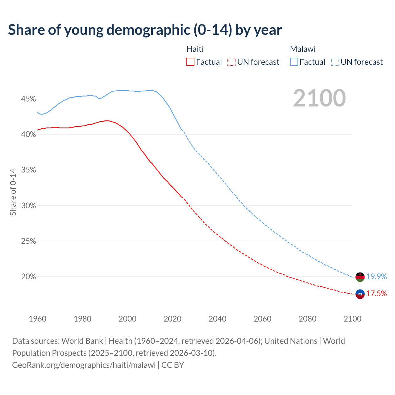 - The share of young demographic (0-15 years old) in Haiti is 31.2% vs 40.7% in Malawi.