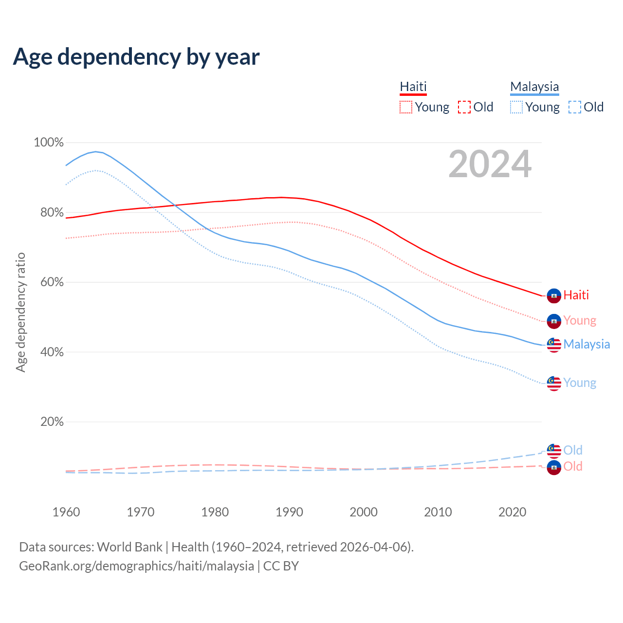 - Haiti is ranked 135/196 by median age (oldest to youngest) vs 92/196 for Malaysia.
