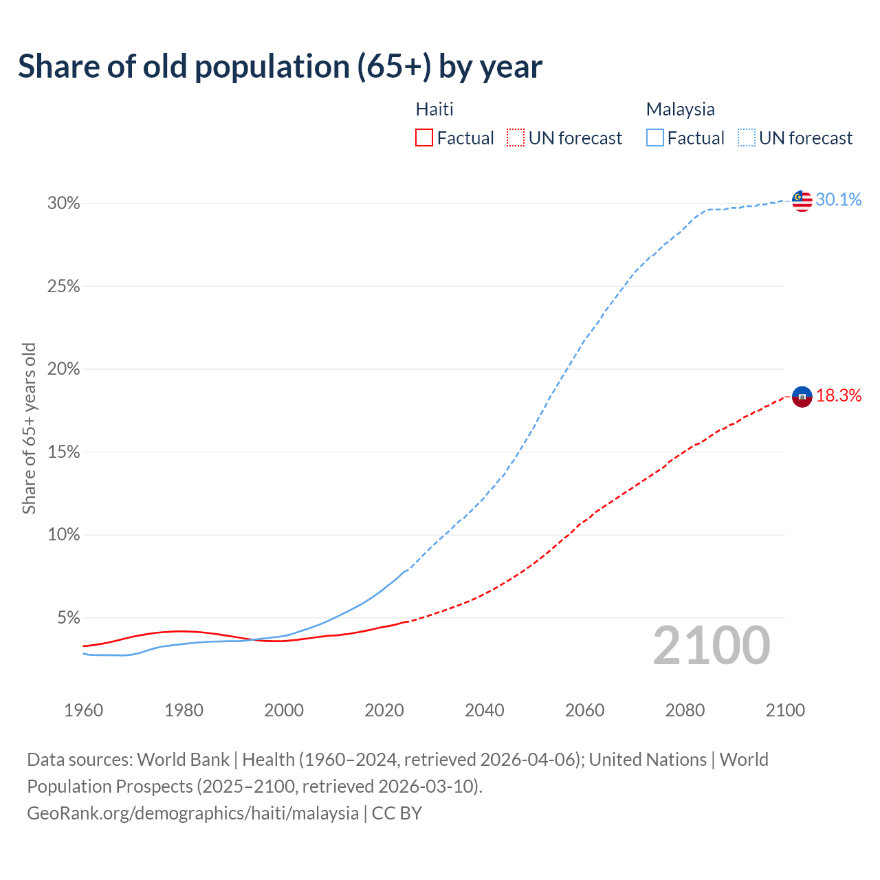 - The share of old-age demographic (65+) in Haiti is 4.71% vs 7.74% in Malaysia.