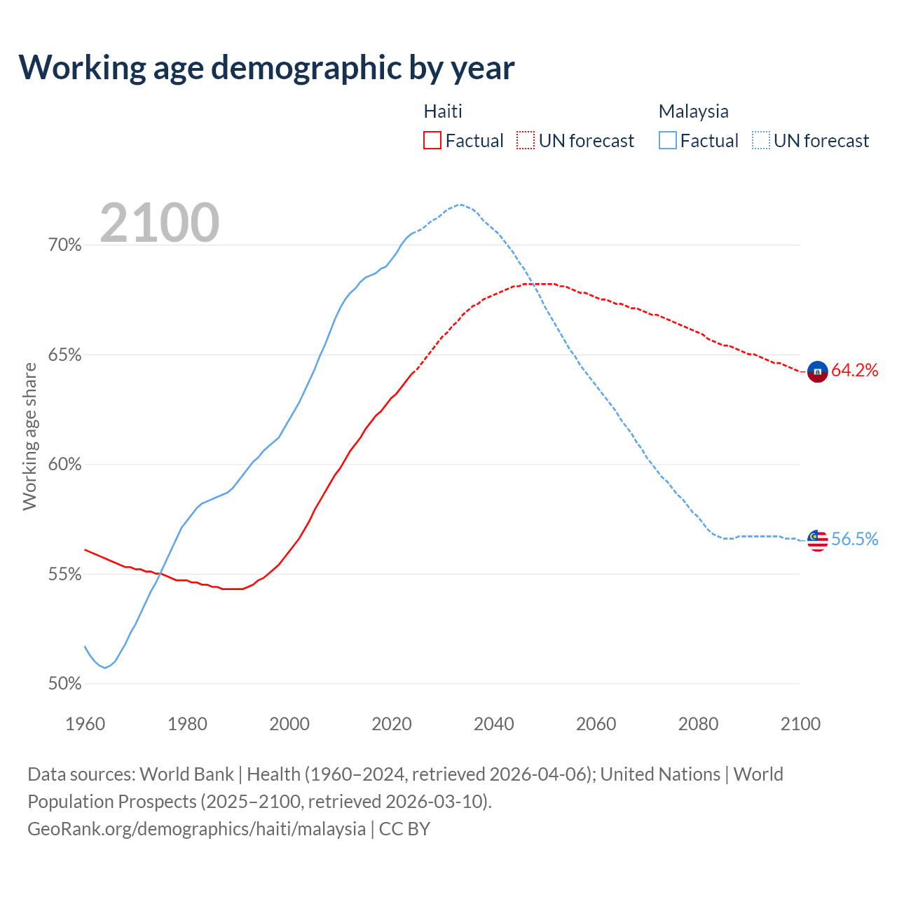 Median age Haiti vs Malaysia, 1960-2100