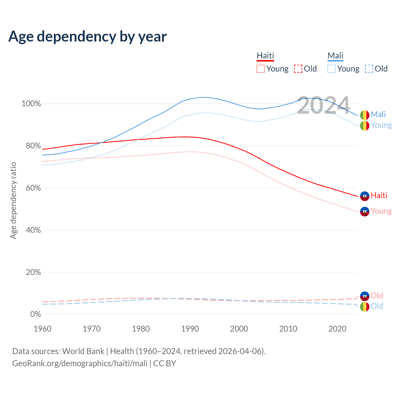 - The share of old-age demographic (65+) in Haiti is 4.71% vs 2.38% in Mali.