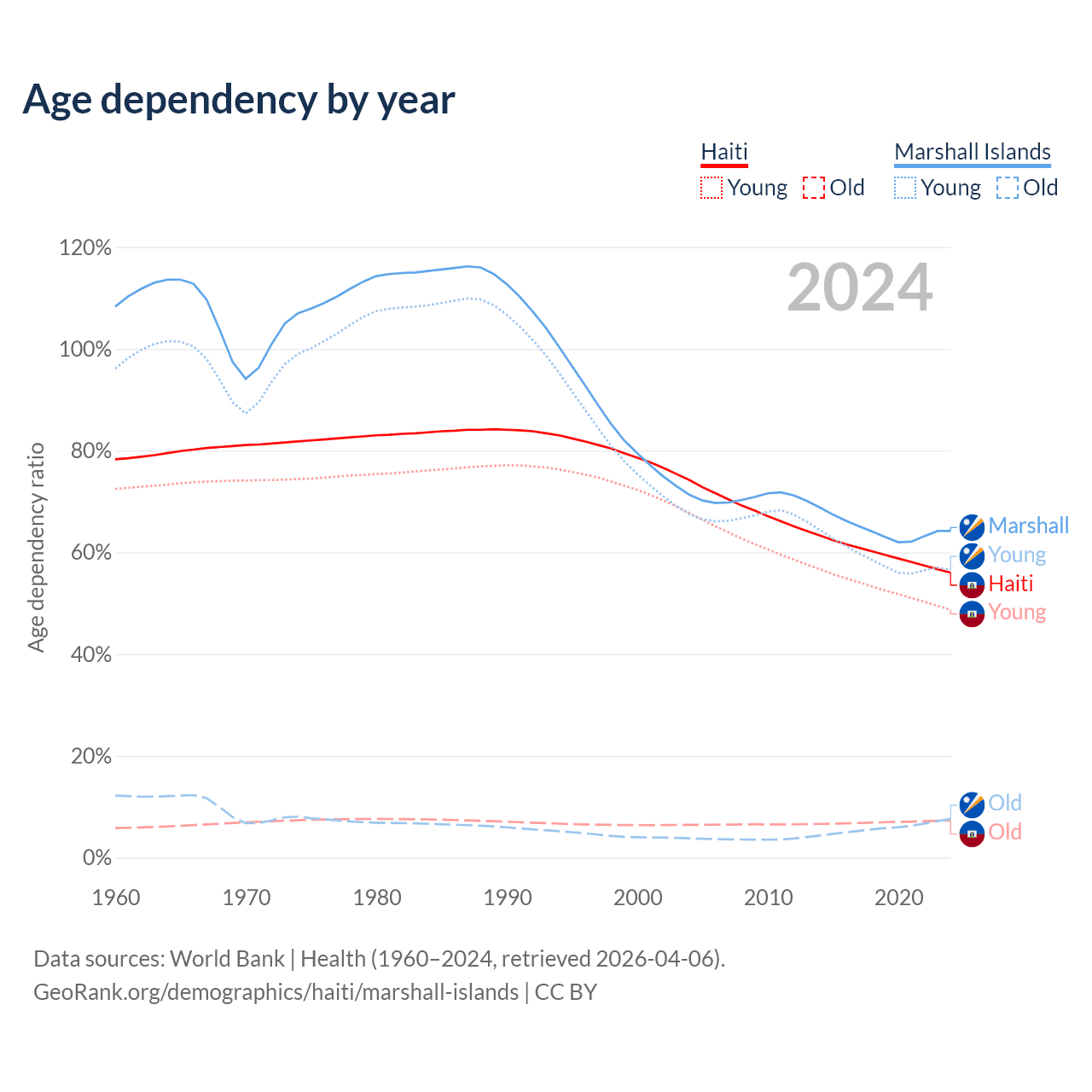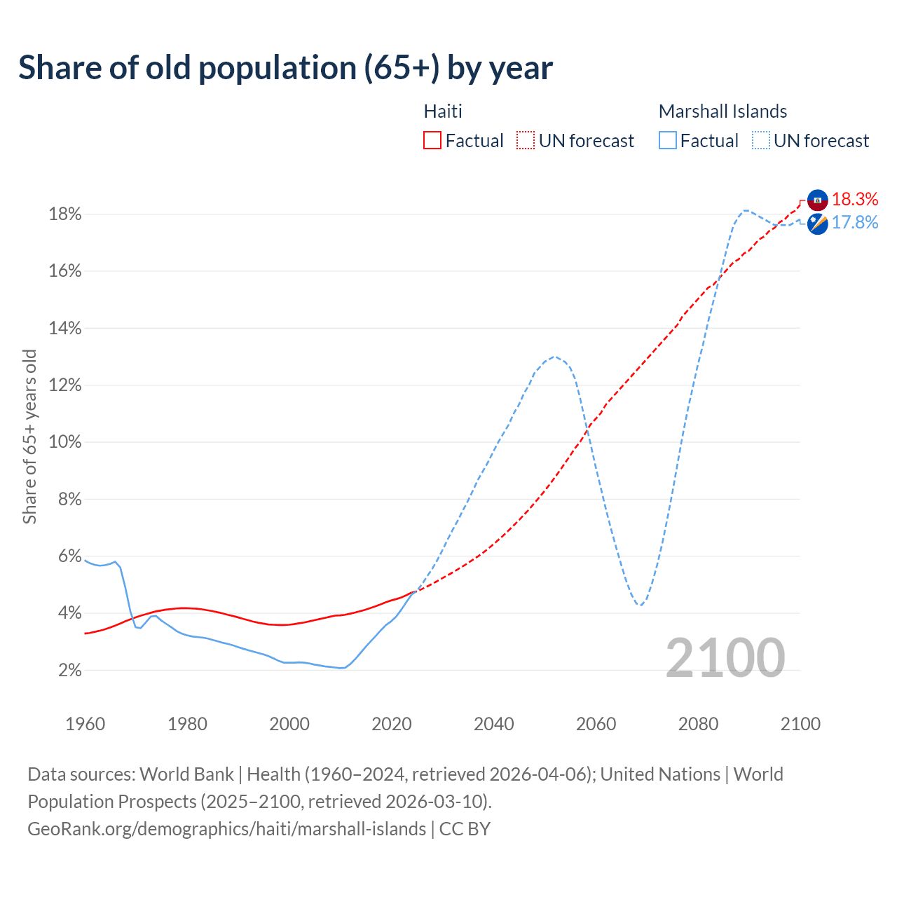 - The share of old-age demographic (65+) in Haiti is 4.71% vs 4.64% in the Marshall Islands.
