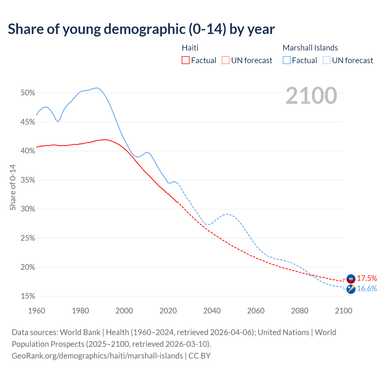 - The share of young demographic (0-15 years old) in Haiti is 31.2% vs 34.5% in the Marshall Islands.