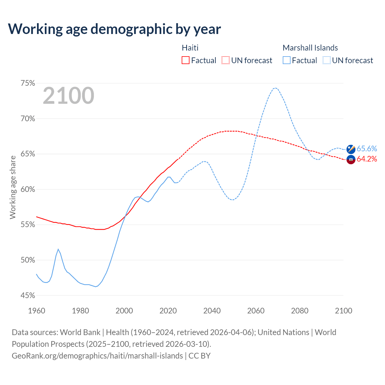 - Haiti has 7.74M working age adults (aged 15-64) vs 21.3K in the Marshall Islands.