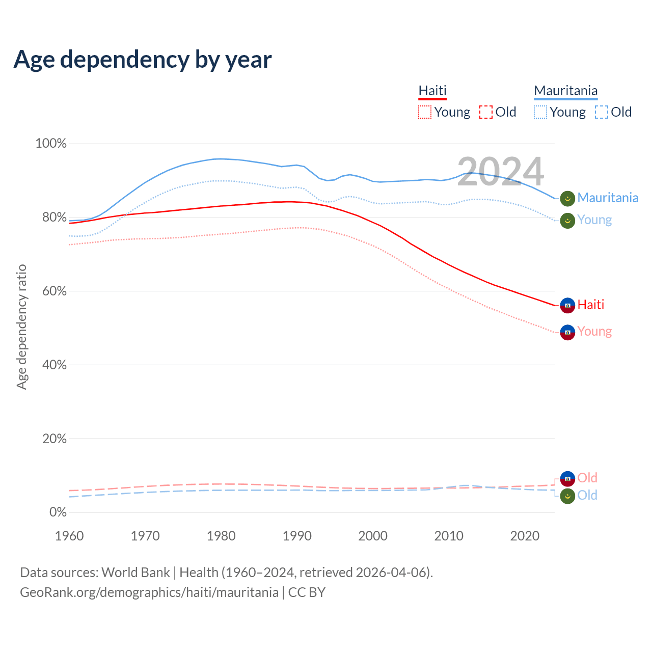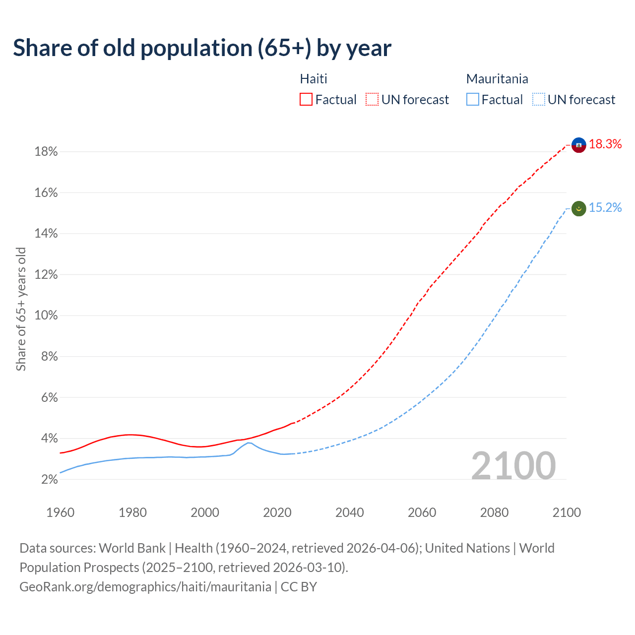 - The share of old-age demographic (65+) in Haiti is 4.71% vs 3.23% in Mauritania.