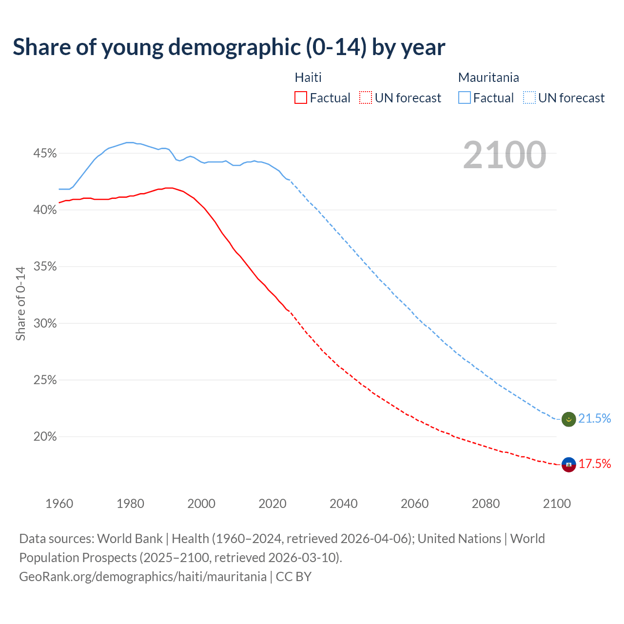 - The share of young demographic (0-15 years old) in Haiti is 31.2% vs 42.7% in Mauritania.