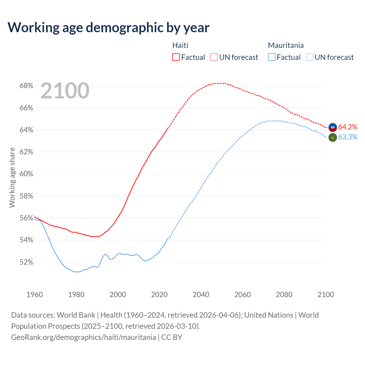 - Haiti has 7.74M working age adults (aged 15-64) vs 2.98M in Mauritania.