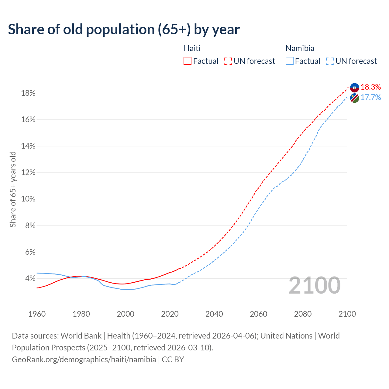 - The share of old-age demographic (65+) in Haiti is 4.71% vs 3.67% in Namibia.