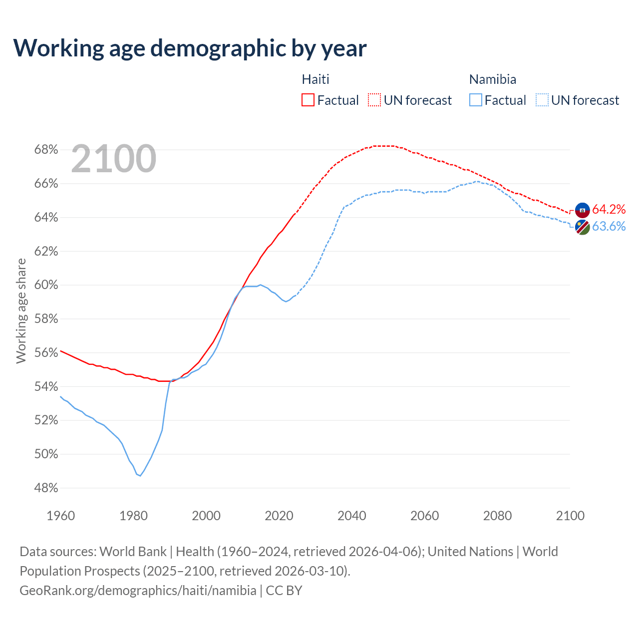 - Haiti has 7.74M working age adults (aged 15-64) vs 1.88M in Namibia.
