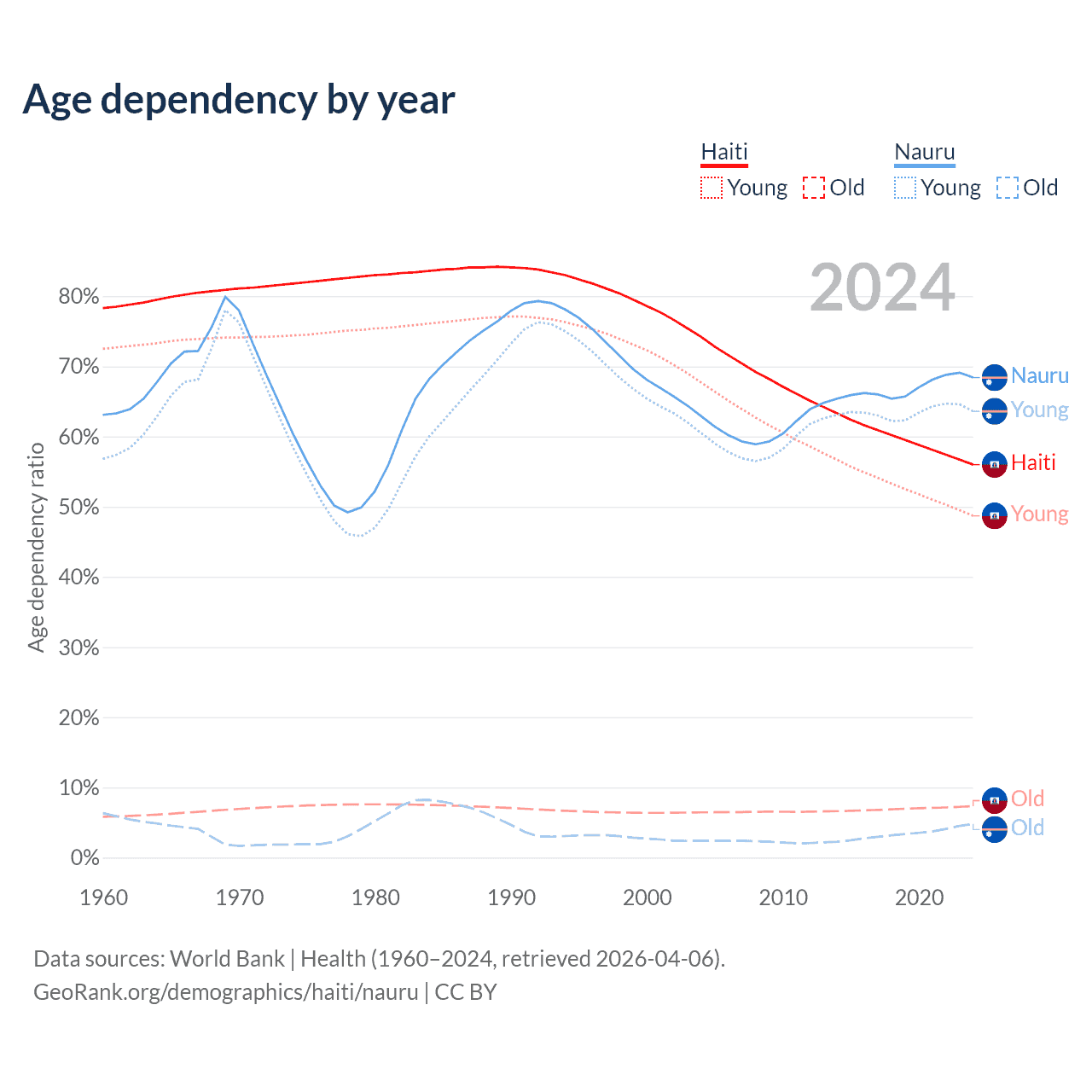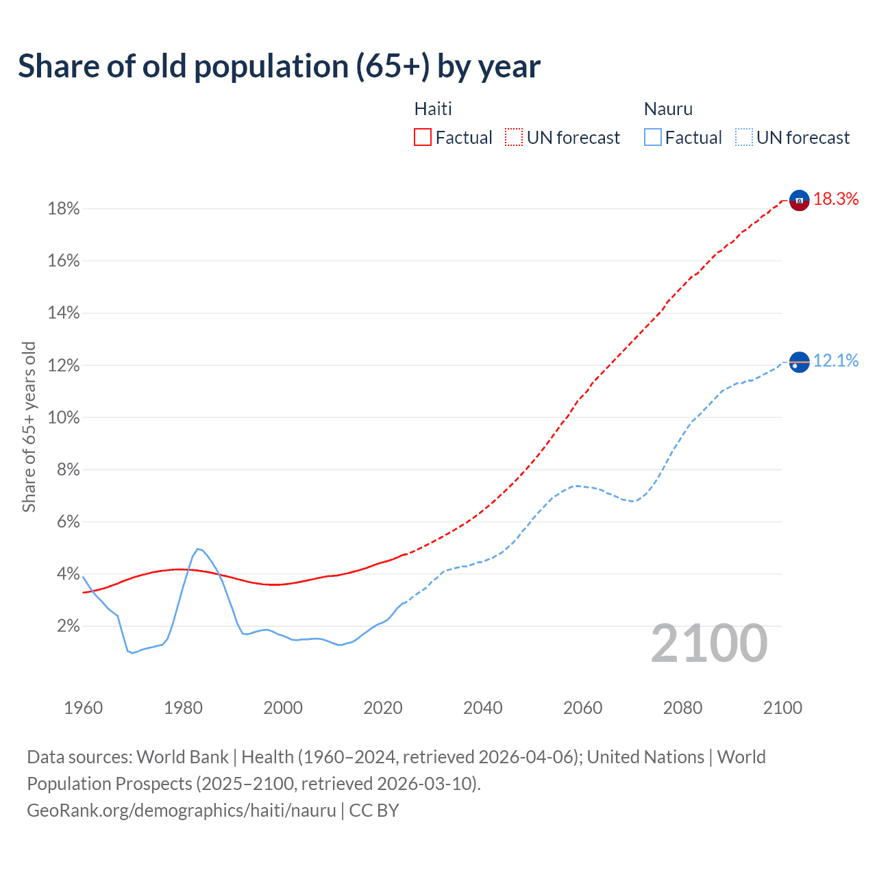 - The share of old-age demographic (65+) in Haiti is 4.71% vs 2.85% in Nauru.