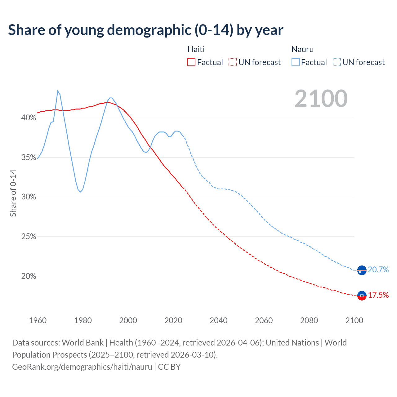 - The share of young demographic (0-15 years old) in Haiti is 31.2% vs 37.8% in Nauru.