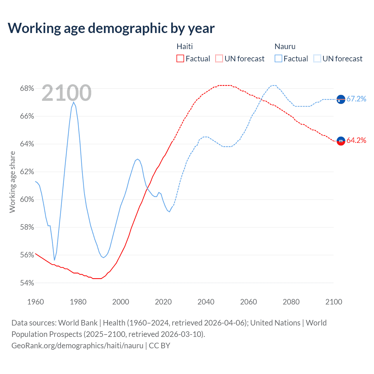 - Haiti has 7.74M working age adults (aged 15-64) vs 7.2K in Nauru.