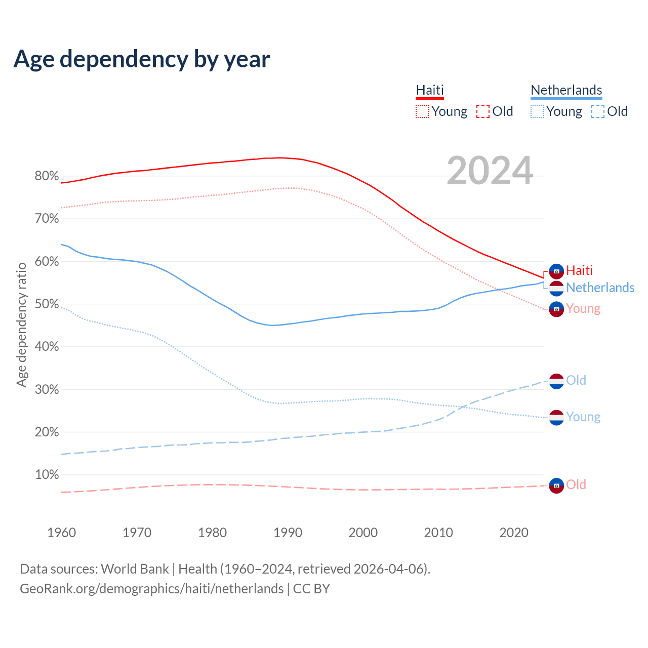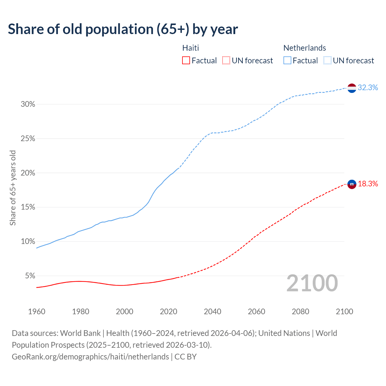 - The share of old-age demographic (65+) in Haiti is 4.71% vs 20.5% in the Netherlands.