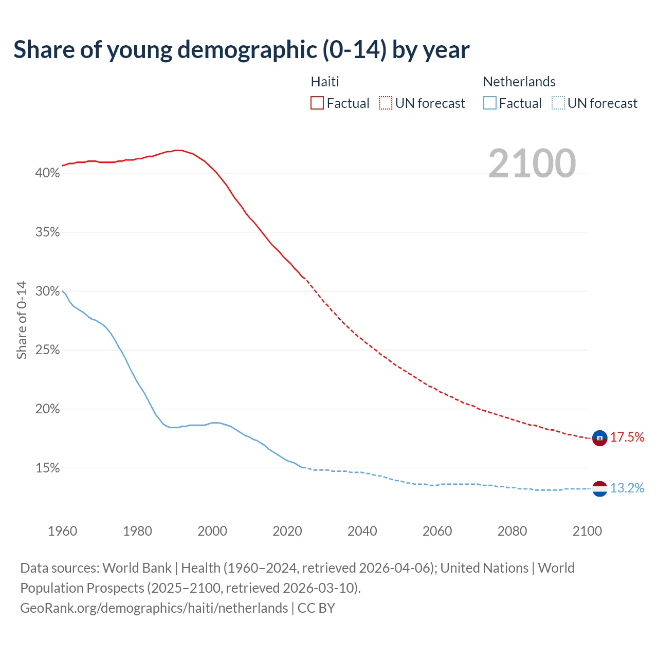 - The share of young demographic (0-15 years old) in Haiti is 31.2% vs 15% in the Netherlands.