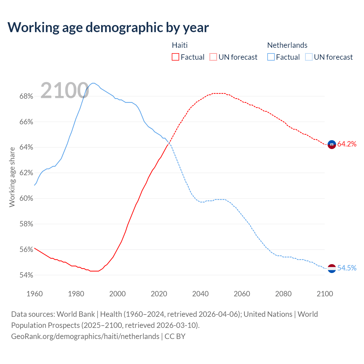 - Haiti has 7.74M working age adults (aged 15-64) vs 11.8M in the Netherlands.