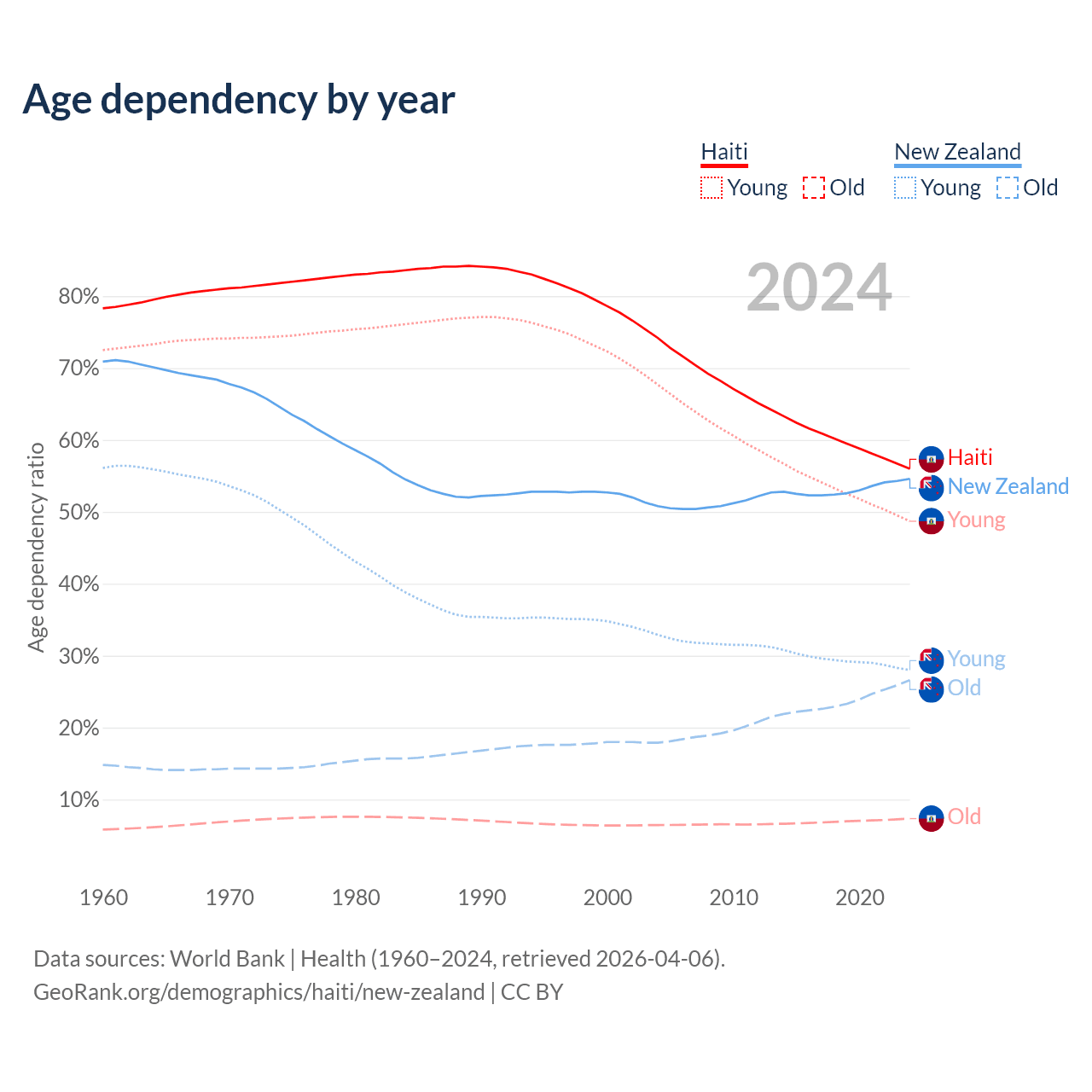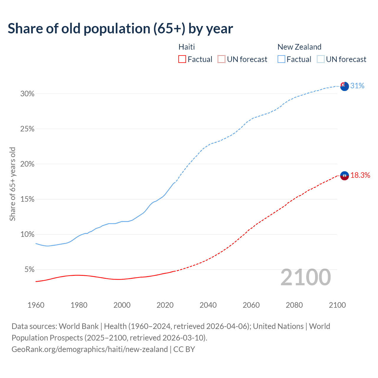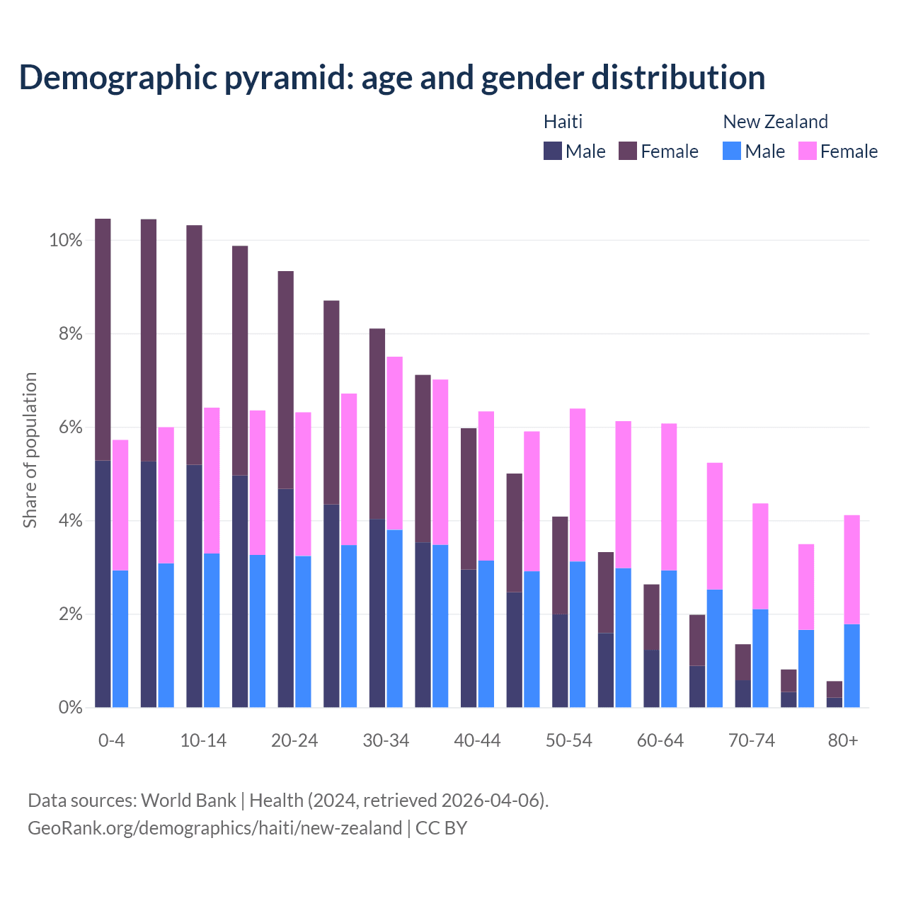- The share of old-age demographic (65+) in Haiti is 4.71% vs 17.2% in New Zealand.