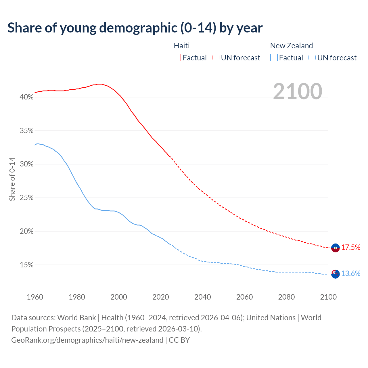 - The share of young demographic (0-15 years old) in Haiti is 31.2% vs 18.1% in New Zealand.