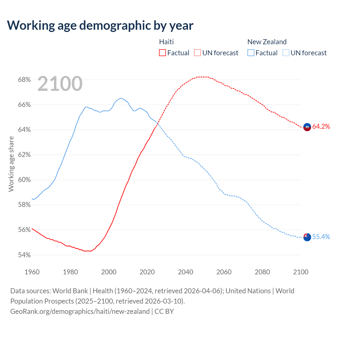 Median age Haiti vs New Zealand, 1960-2100