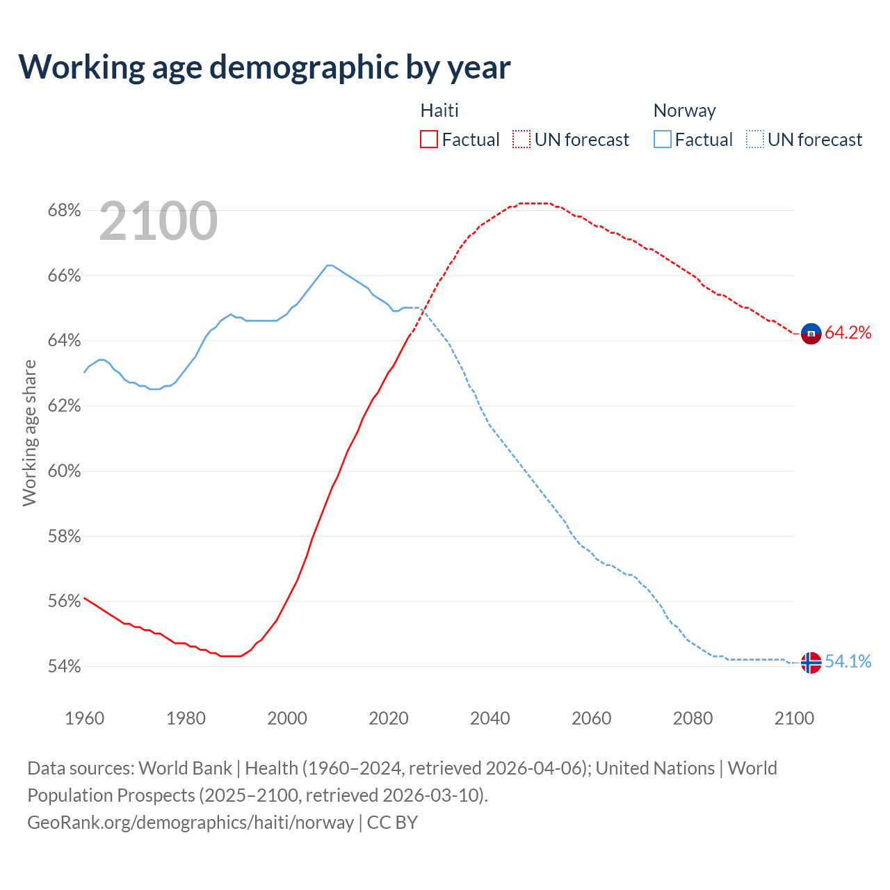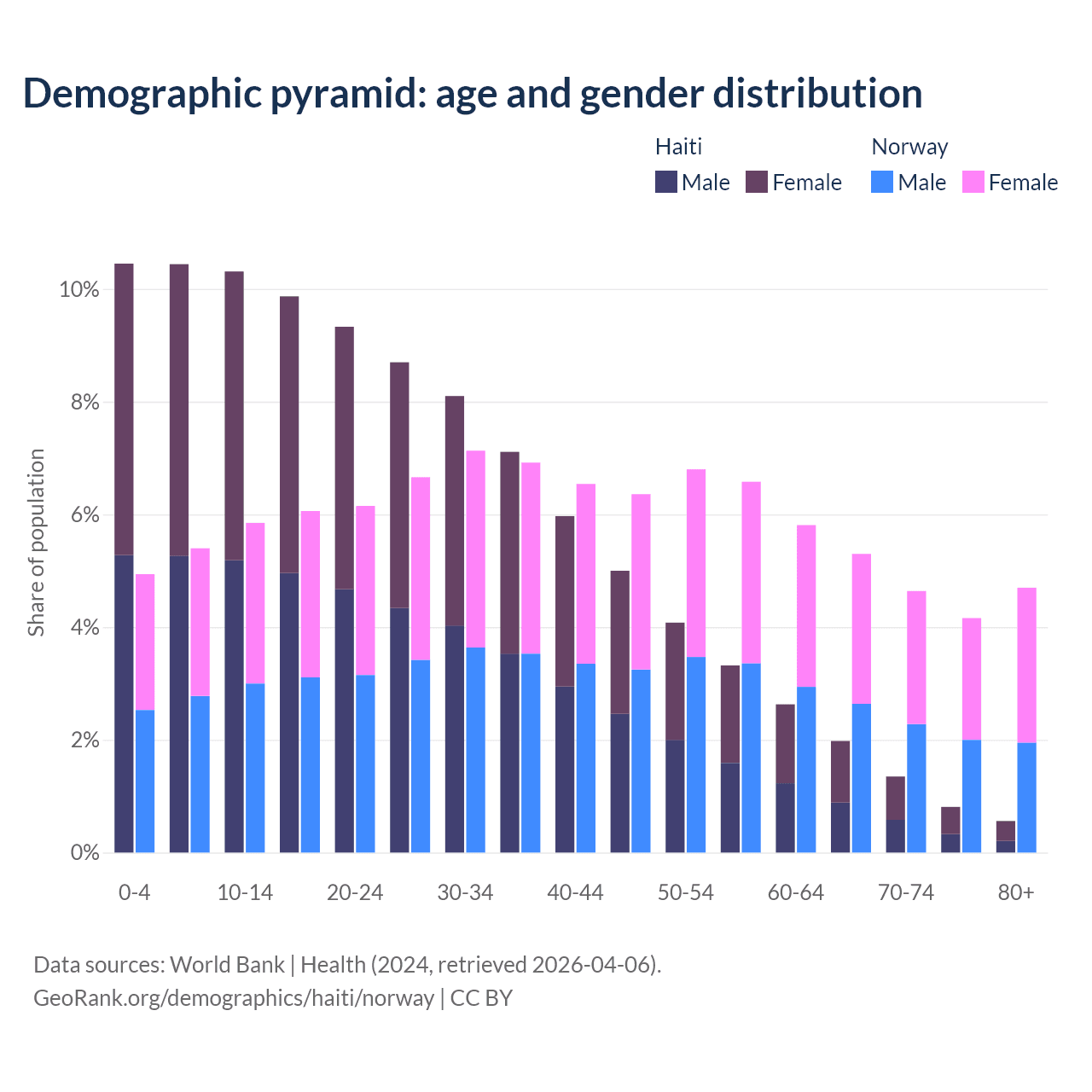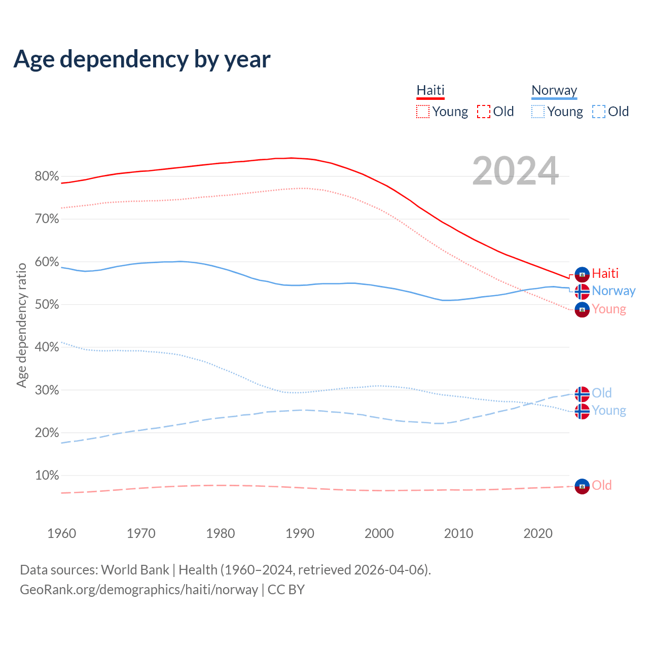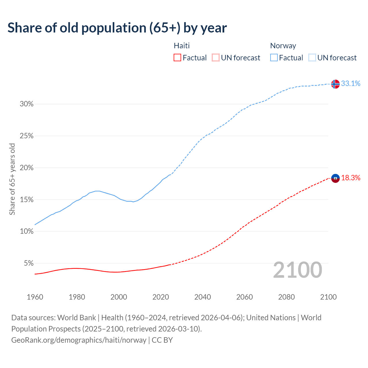 - The share of old-age demographic (65+) in Haiti is 4.71% vs 18.8% in Norway.