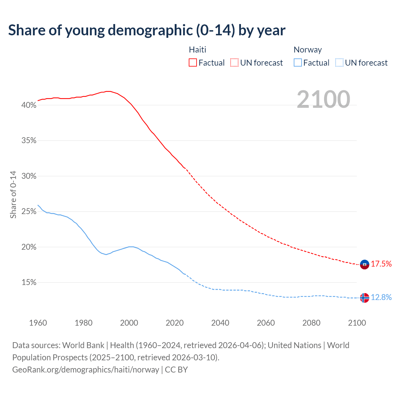 - The share of young demographic (0-15 years old) in Haiti is 31.2% vs 16.2% in Norway.
