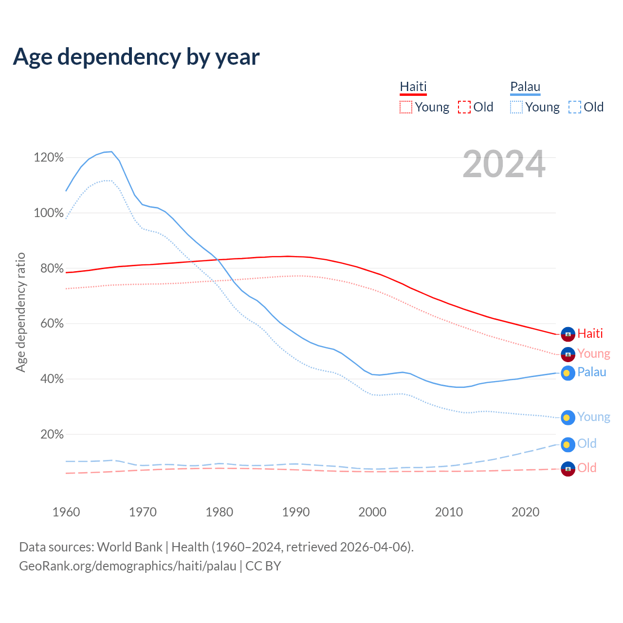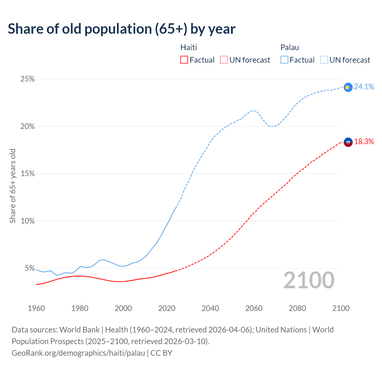 - The share of old-age demographic (65+) in Haiti is 4.71% vs 11.3% in Palau.
