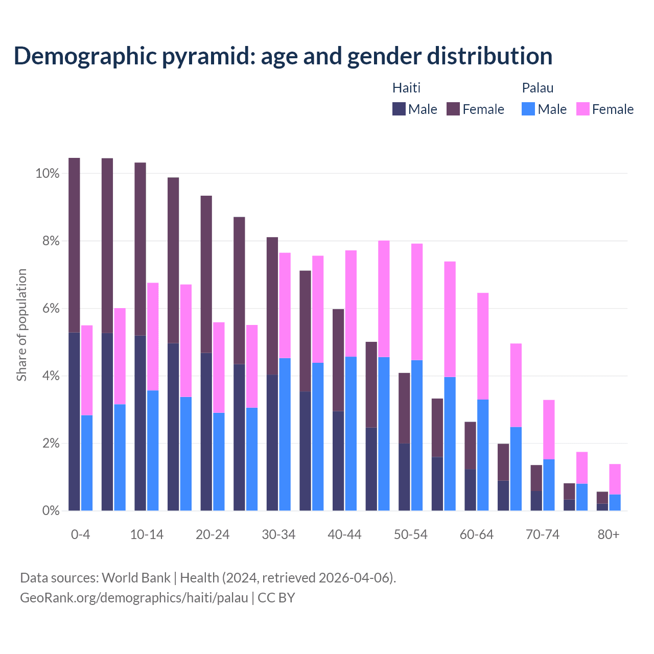 - As of 2026, the population of Haiti is 12.1M vs 17.6K in Palau - 685 times difference.