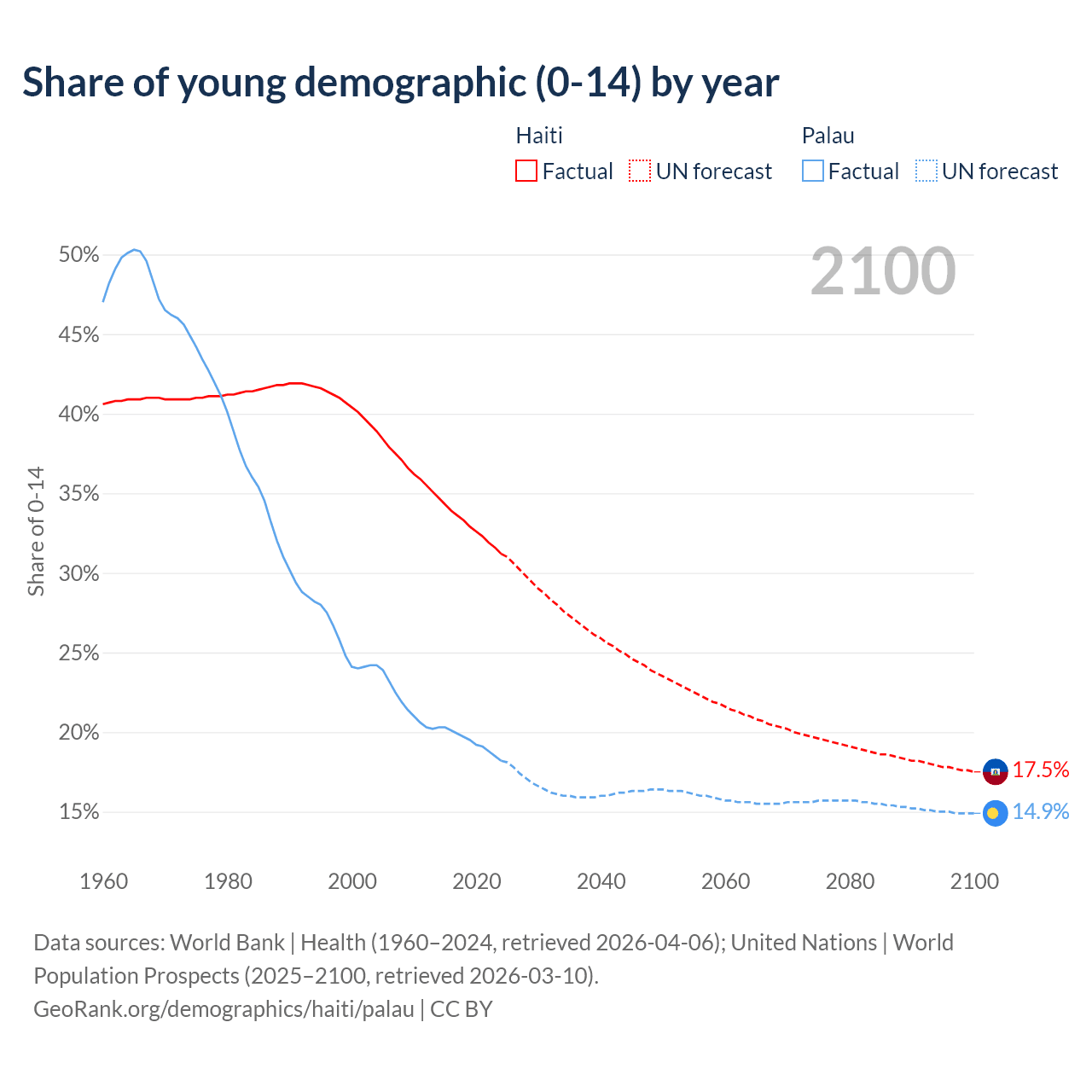 - The share of young demographic (0-15 years old) in Haiti is 31.2% vs 18.2% in Palau.