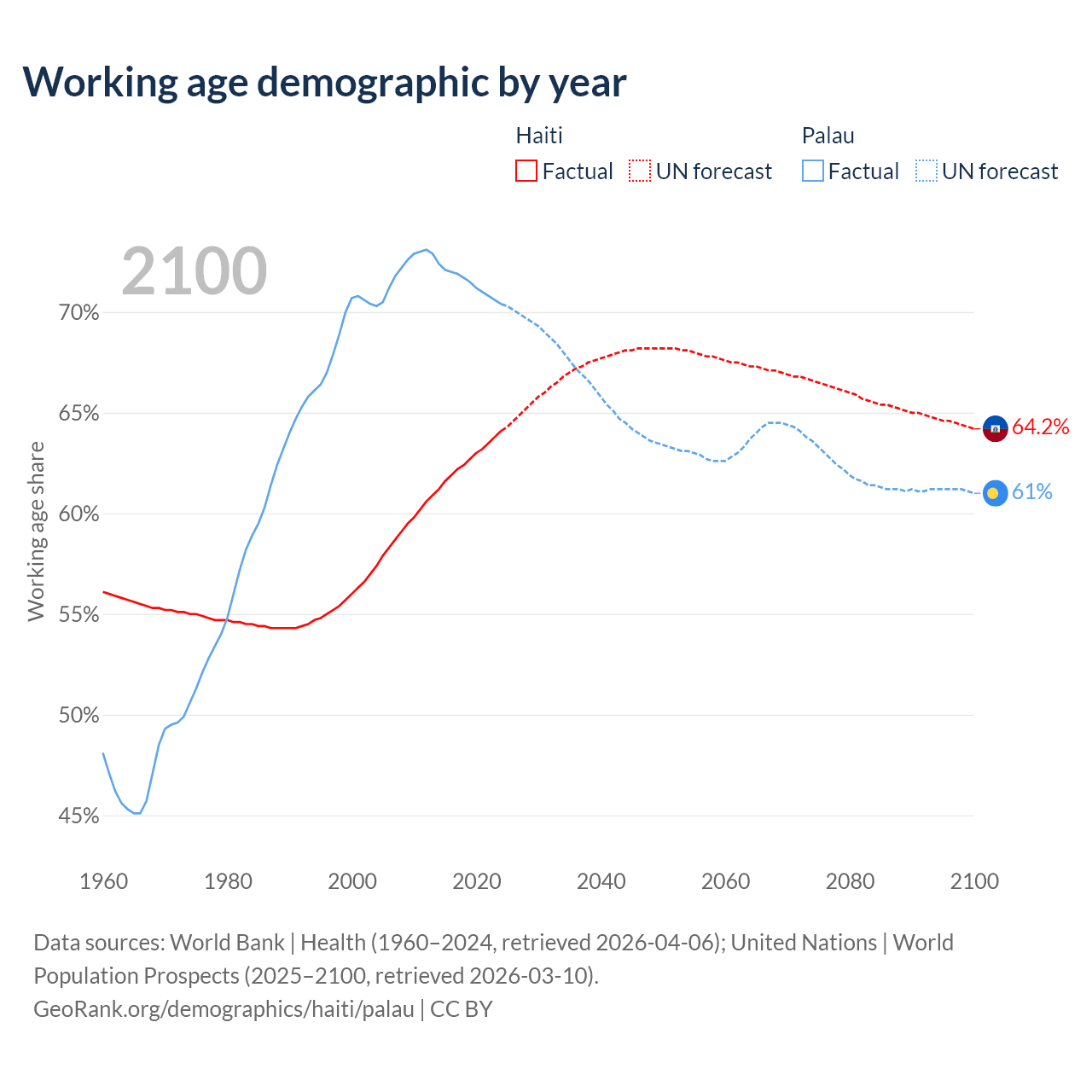 - Haiti has 7.74M working age adults (aged 15-64) vs 12.4K in Palau.