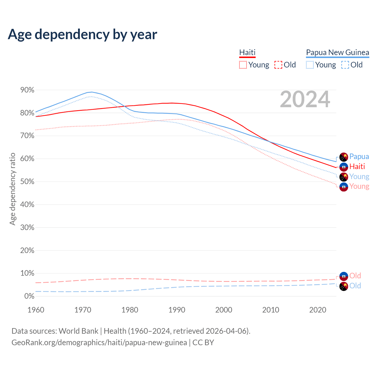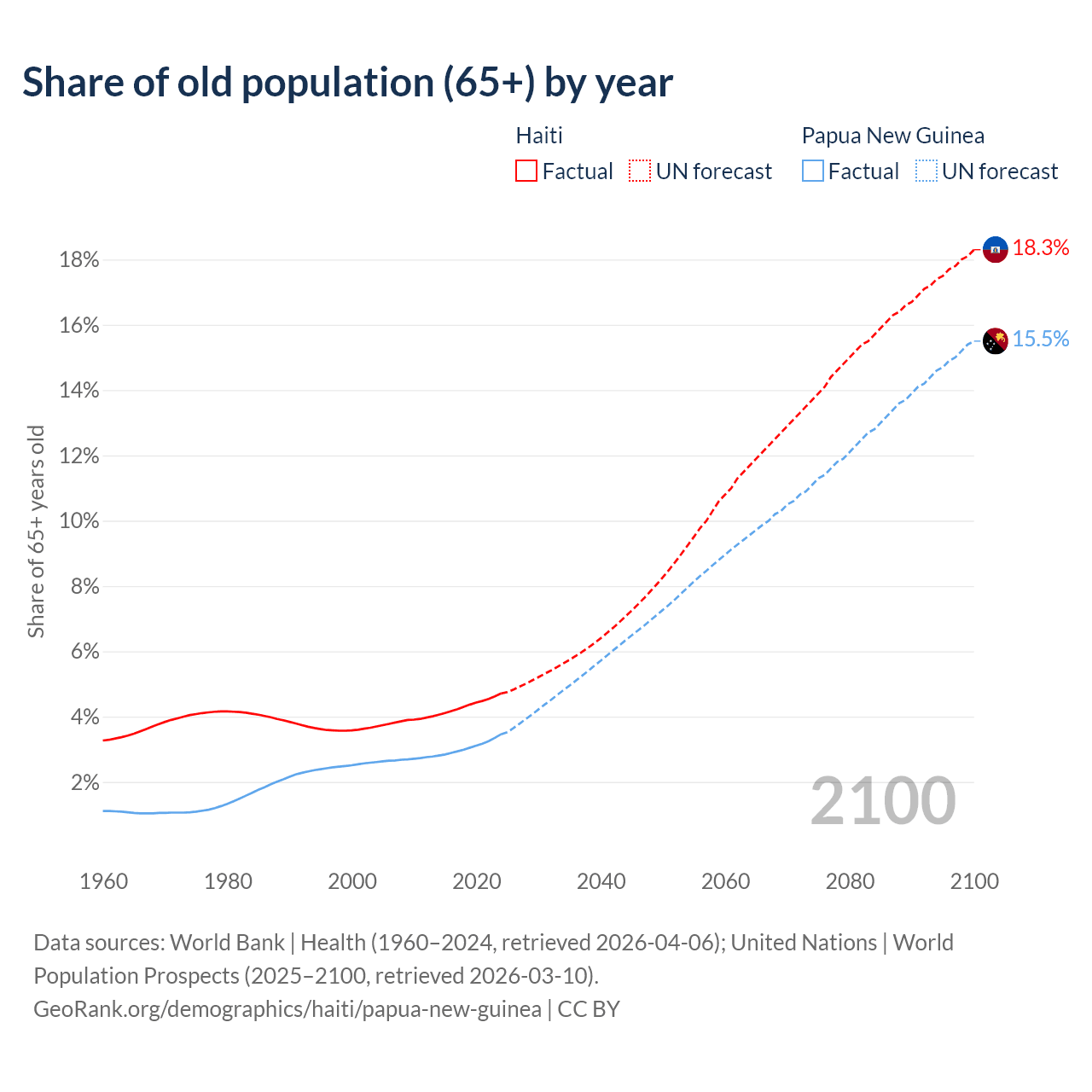- The share of old-age demographic (65+) in Haiti is 4.71% vs 3.46% in Papua New Guinea.