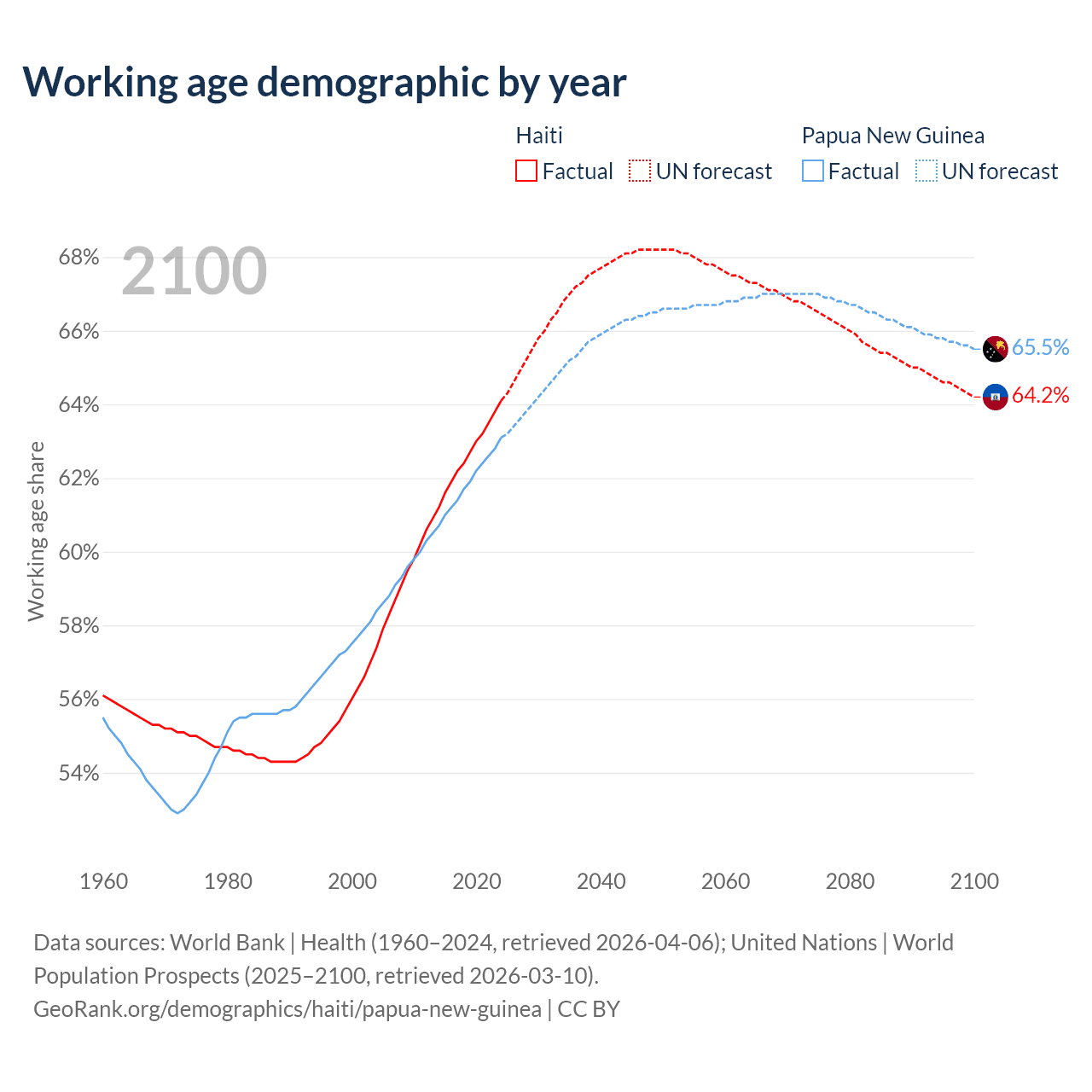 Median age Haiti vs Papua New Guinea, 1960-2100