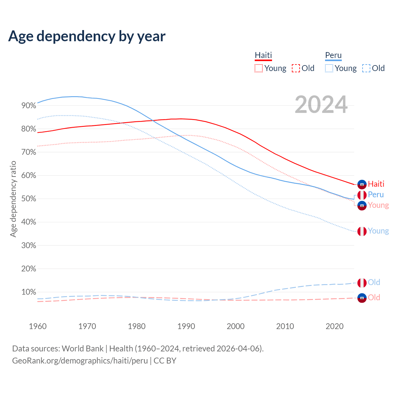 - The share of old-age demographic (65+) in Haiti is 4.71% vs 9.23% in Peru.