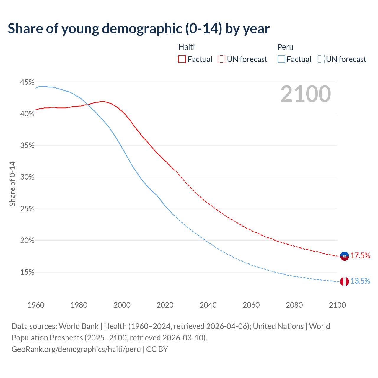 - The share of young demographic (0-15 years old) in Haiti is 31.2% vs 24% in Peru.