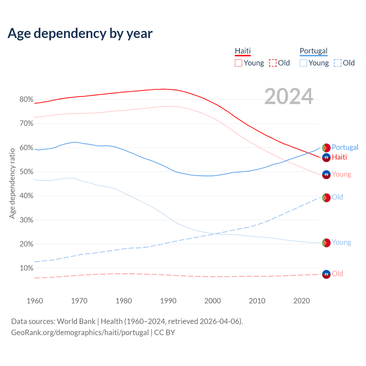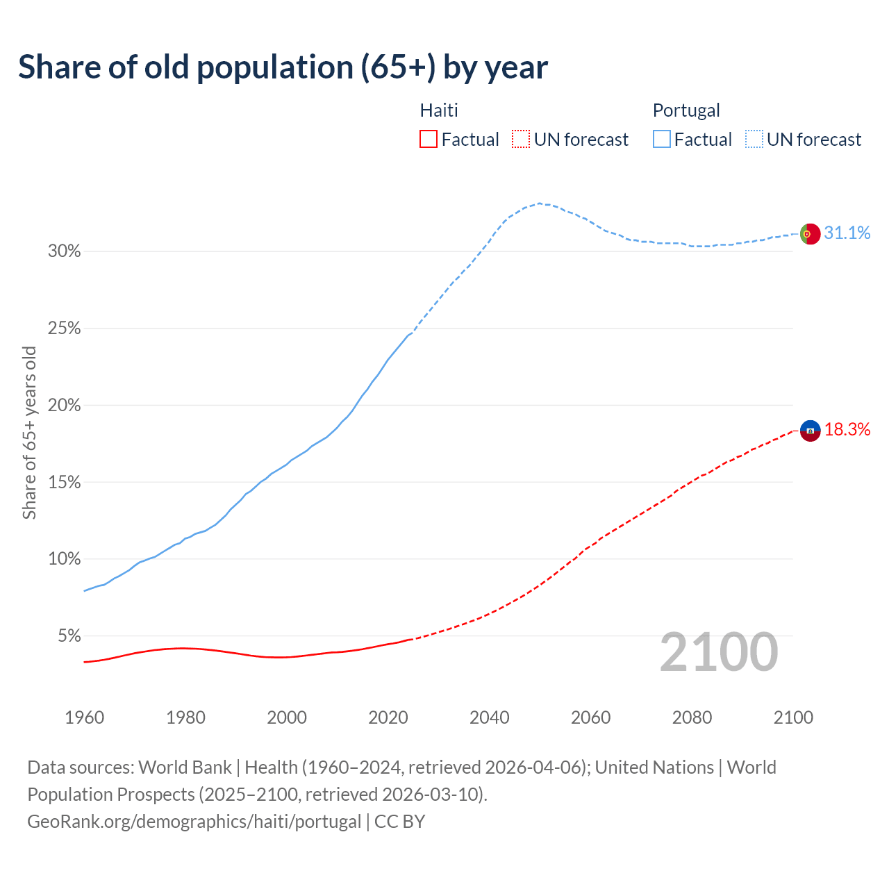 - The share of old-age demographic (65+) in Haiti is 4.71% vs 24.5% in Portugal.