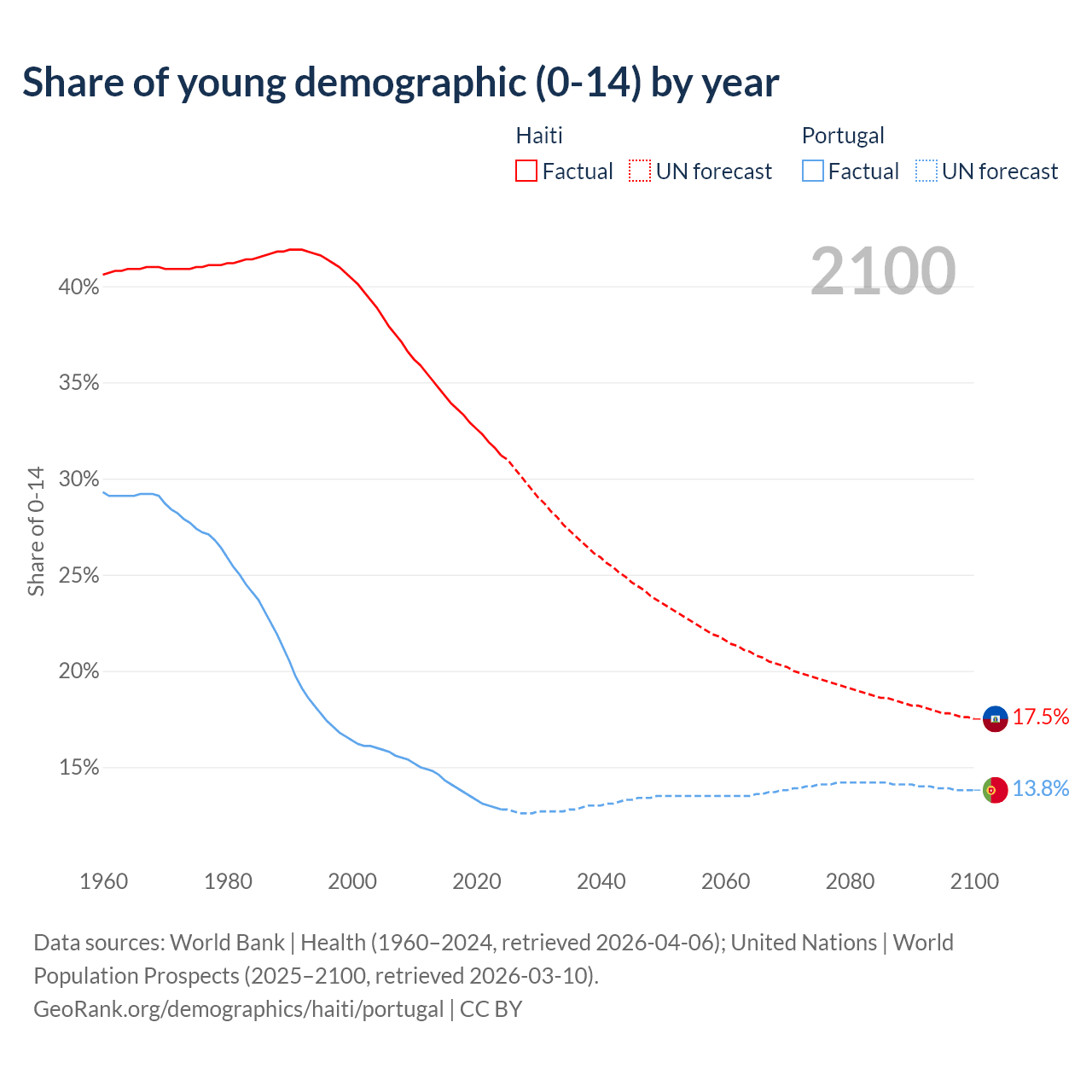 - The share of young demographic (0-15 years old) in Haiti is 31.2% vs 12.8% in Portugal.