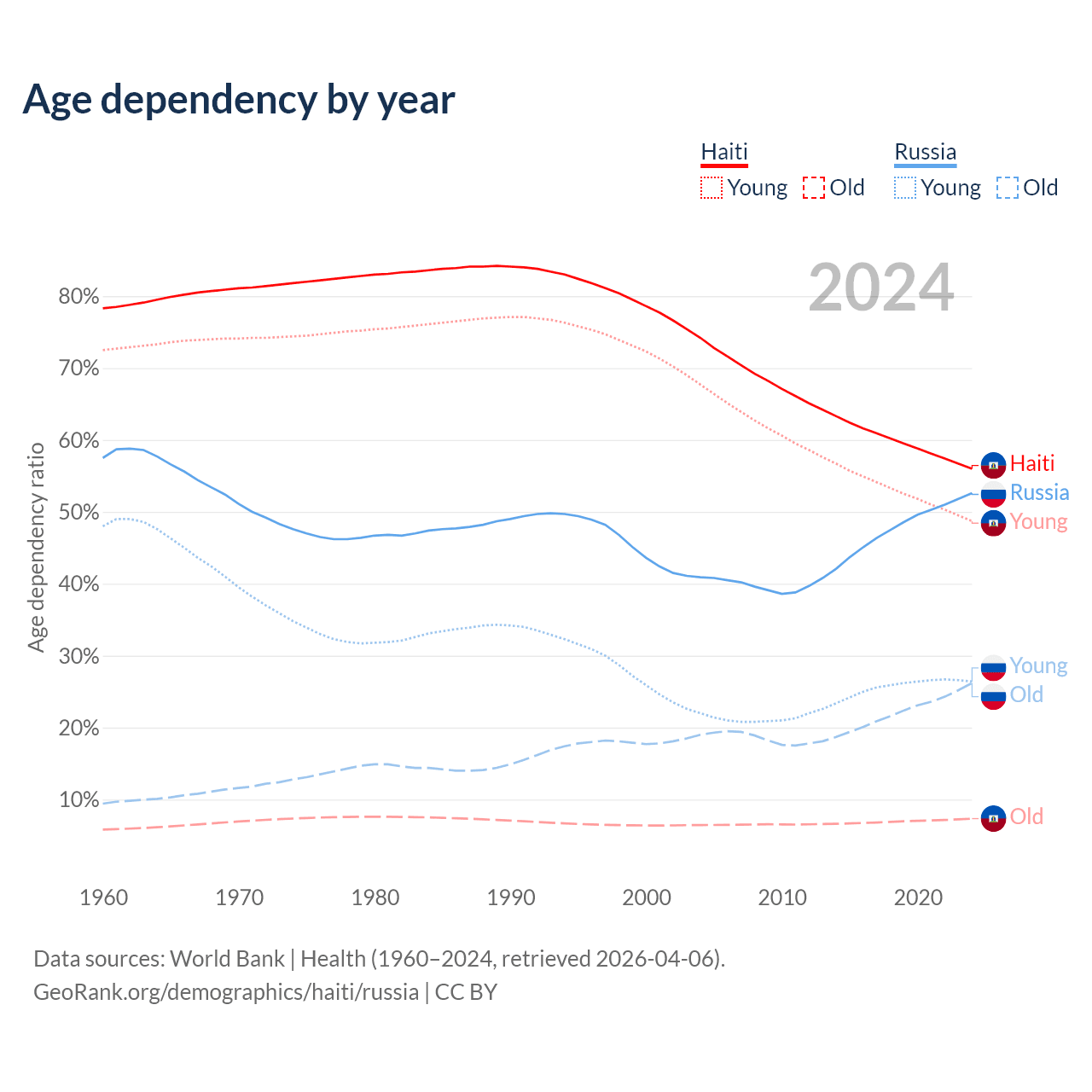 - The share of old-age demographic (65+) in Haiti is 4.71% vs 17.2% in Russia.