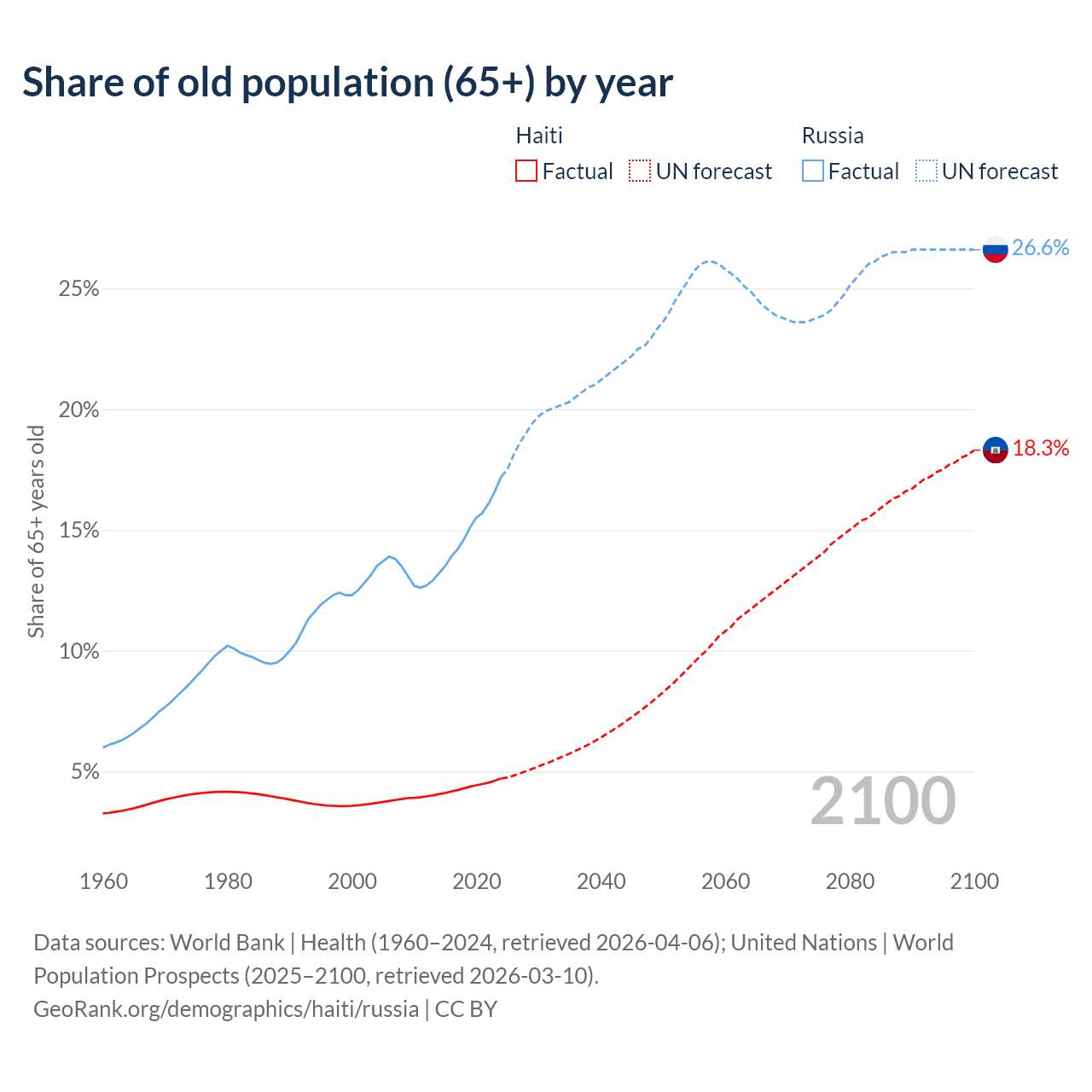 The share of older people aged 65 and over is 4.71% in Haiti and 17.2% in Russia. Life expectancy in Haiti compared to Russia .