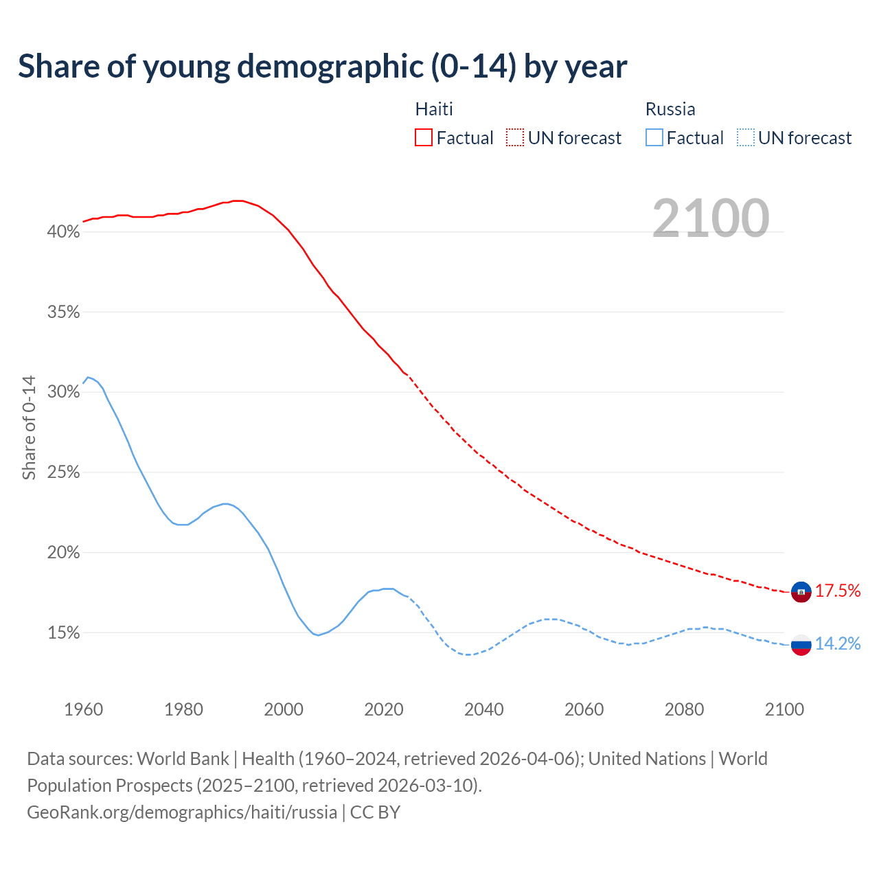 - The share of young demographic (0-15 years old) in Haiti is 31.2% vs 17.3% in Russia.