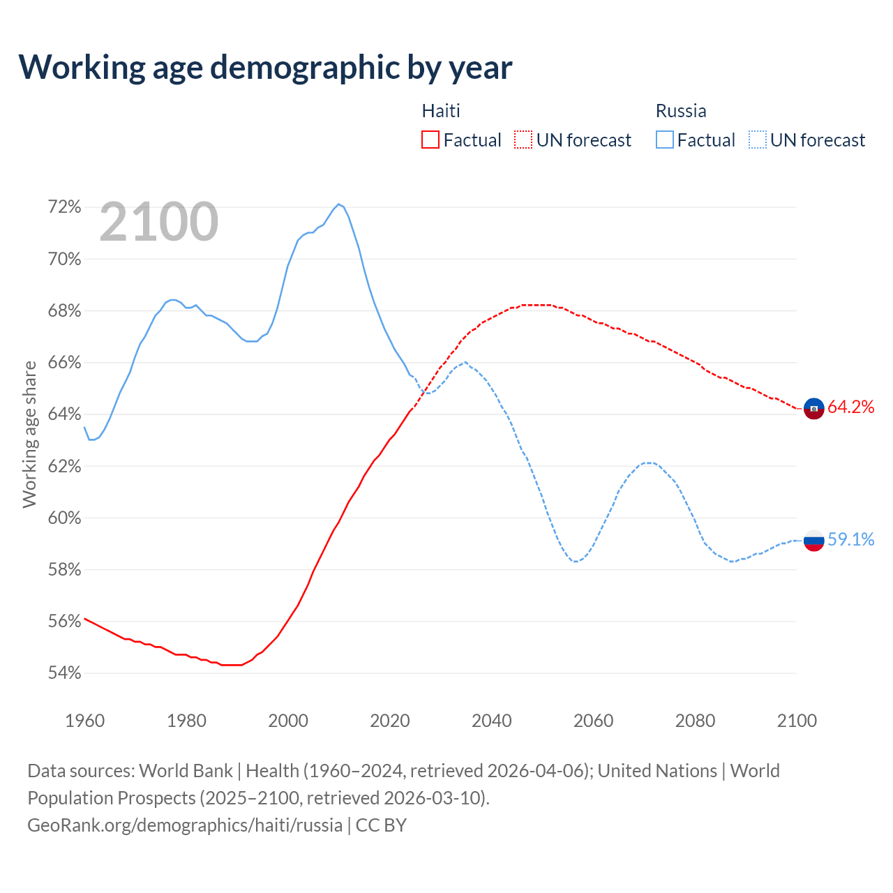 - Haiti has 7.74M working age adults (aged 15-64) vs 93M in Russia.